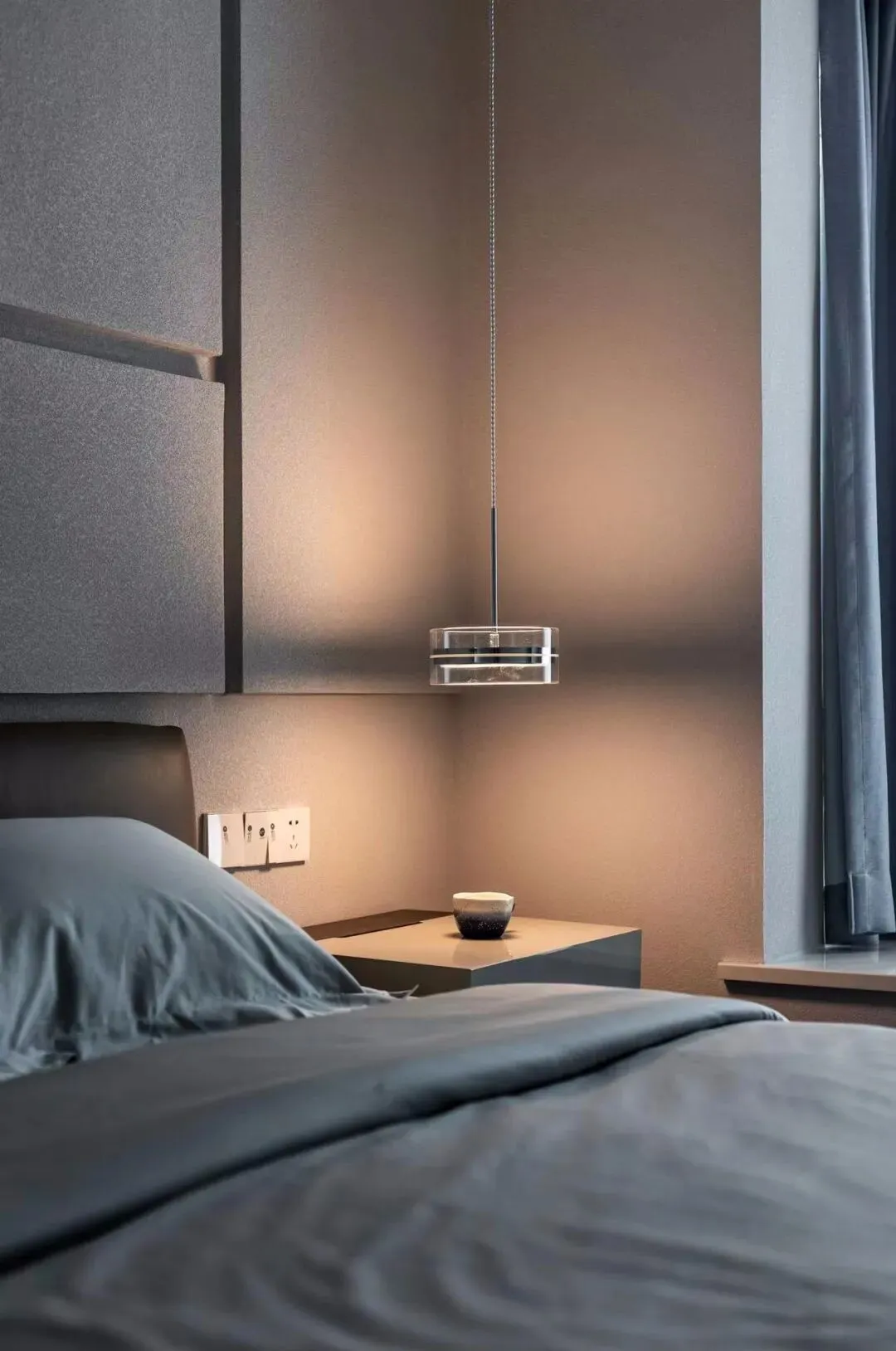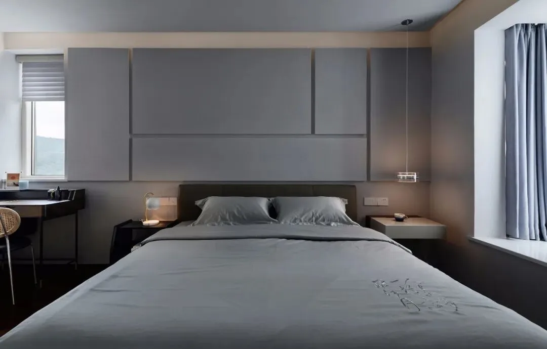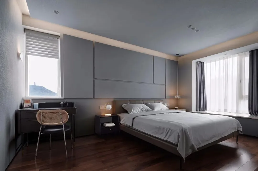 不同于其他空间的暖色调,主卧以静谧的蓝灰色为主,更有助于屋主的放松和助眠。
