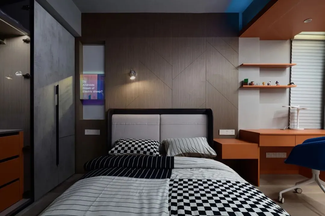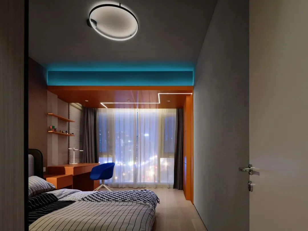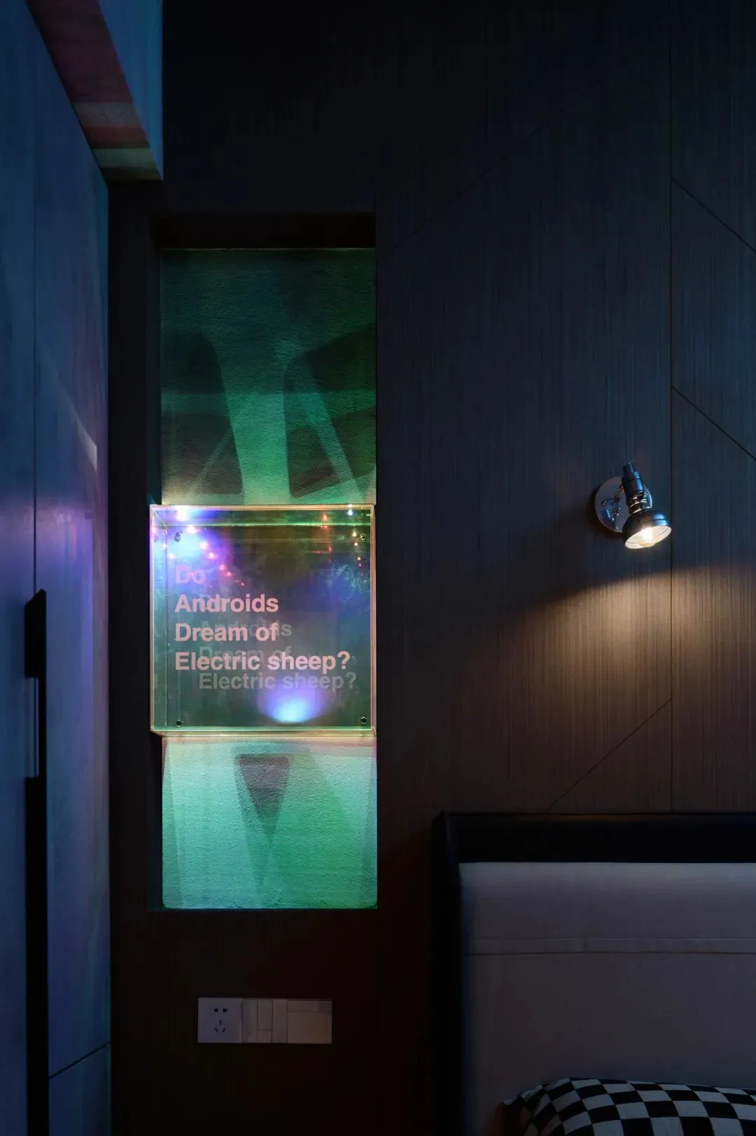屋主女儿的房间则主打赛博朋克风,不同材质与元素的相互融合,再搭配炫酷的灯光,科技感直接拉满。