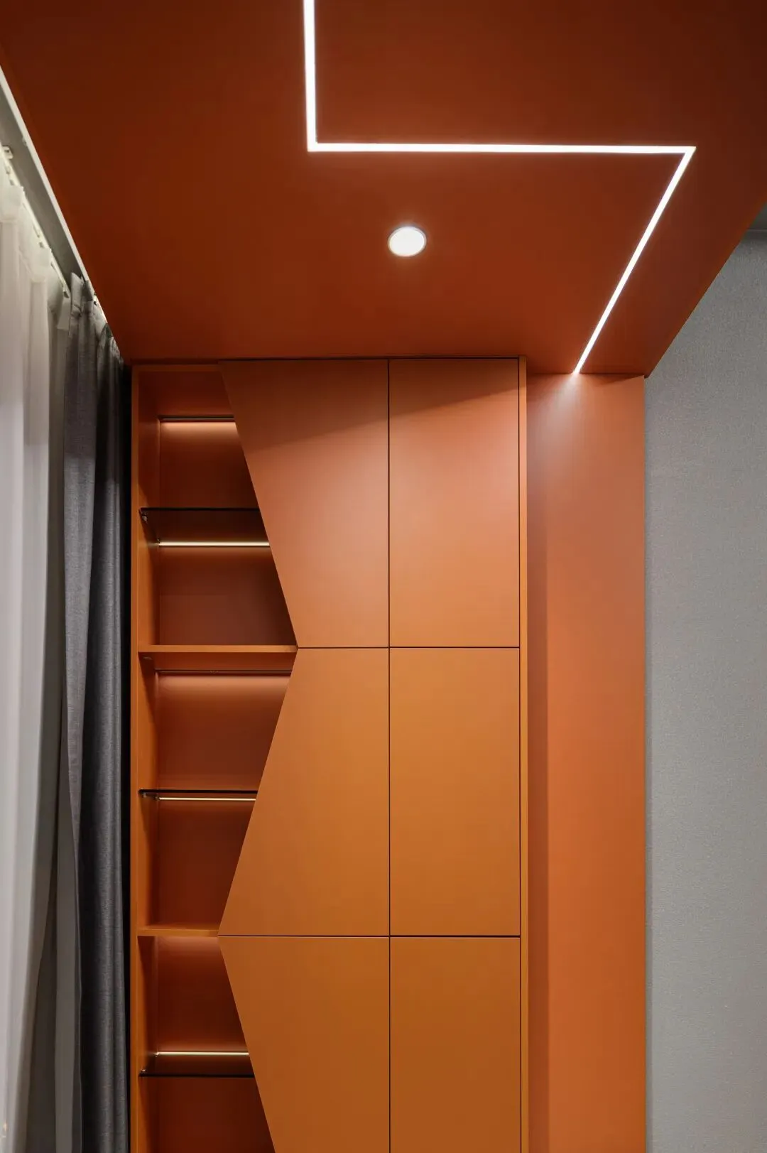 跳跃的橙色从墙面延伸至吊顶,折叠的立体造型,带来极大的视觉冲击力。