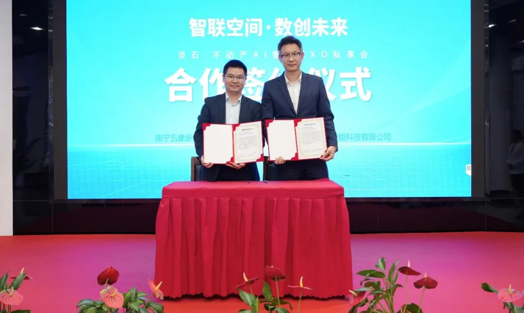 尾声阶段,南宁五象新区产业投资集团有限公司、广西惠赚科技有限公司等四家企业现场签署合作协议,标志着“灵石” 在不动产智能化领域的应用落地再添重要成果。