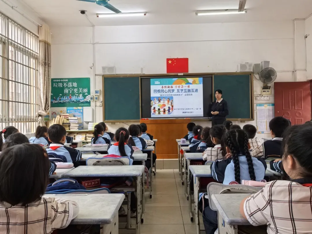 紧接着,各班以“同根同心同梦 互学互融互进”为主题开展班会活动。引导同学们深刻认识铸牢中华民族共同体意识的重要意义。孩子们踊跃发言、积极分享,在交流中增进理解,在互动中凝聚力量,民族团结的种子在学子心中悄然发芽。