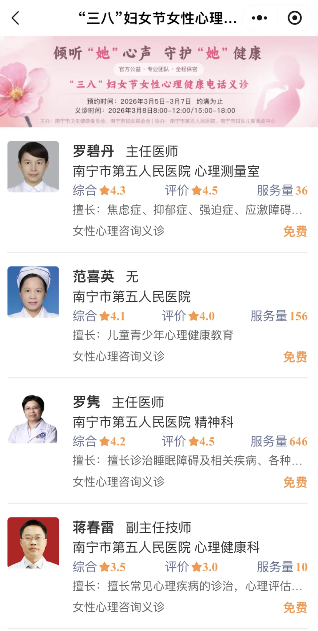 本次义诊集结11名资深精神心理医师+9名专业咨询师、治疗师,均具备国家专业资质,且针对女性各年龄段心理特点接受专项培训。医师团队覆盖儿童青少年心理科、睡眠科、抑郁病区、心身疾病科等多个专科,咨询师团队咨询经验丰富,精准对接不同女性的心理需求,为你提供科学、专业的心理建议与疏导。全年龄段精准对接你的烦恼都有专属解答无论你处于人生哪个阶段遇到的心理困扰都能找到对应咨询方向