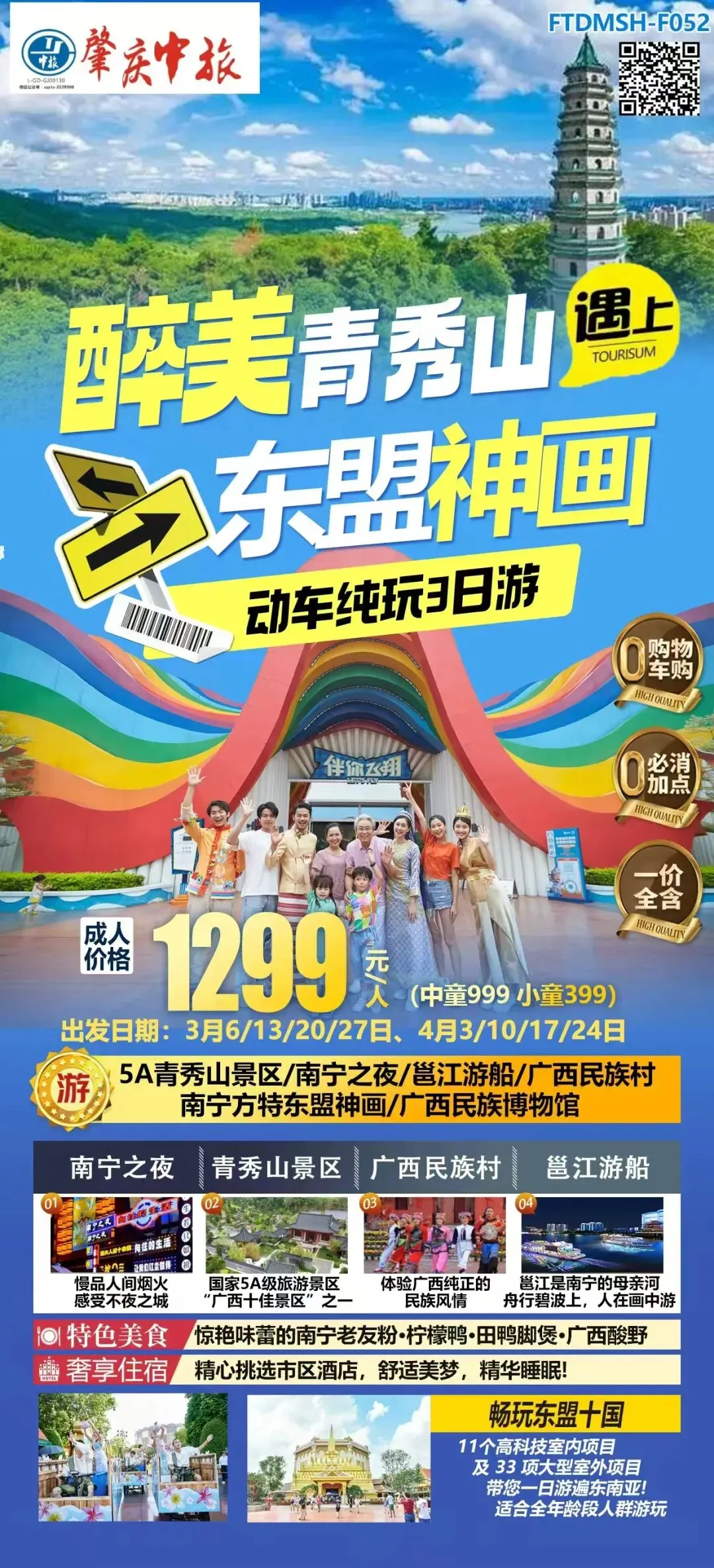 【3月6/13号出发】南宁方特东盟神画&5A青秀山&邕江游船&之夜...动车3天
