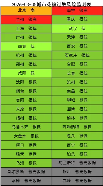 南宁、兰州花粉过敏风险很高!北京花粉过敏风险高!共有 7 个城市最近5日曾经花粉浓度过敏风险中等以上,3月5日花粉过敏指数播报