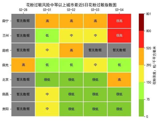 南宁, 兰州, 昆明, 南充, 北京, 南昌, 贵阳, 共有 7 个城市最近5日曾经花粉浓度过敏风险中等以上,请持续注意防护!