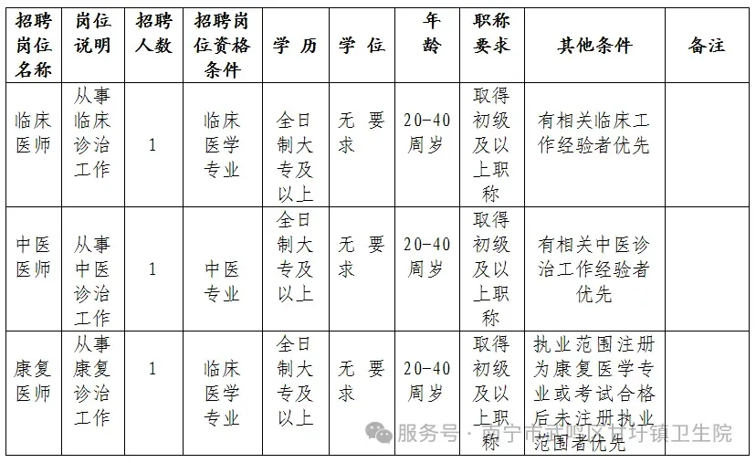声明:本微信公众号刊载此文,无任何商业目的,目的是架起求职者和用人单位之间的桥梁,传递更多的招聘就业信息。若来源标注错误或侵犯了您的合法权益,请及时与我们联系,我们将及时更正、删除或依法处理,微信号(含:商务合作):xiongcairenli 根据医院业务发展需要,现向社会公开招聘以下岗位人员,具体招聘事宜如下:一、招聘岗位、人数、专业和资格条件