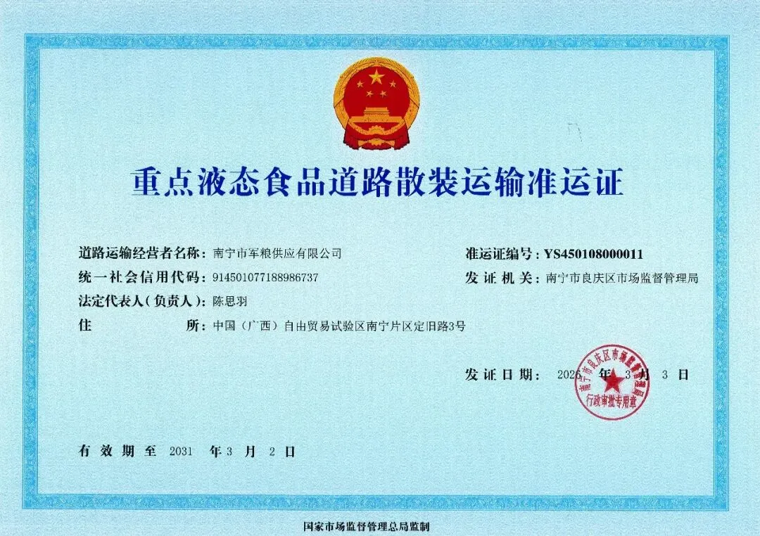 近日,南宁市军粮供应有限公司顺利通过南宁市良庆区市场监督管理局现场审核验收,于2026年3月3日正式取得广西壮族自治区重点液态食品道路散装运输准运证,标志着公司在与食品物流规范化、专业化、安全化建设方面迈出关键一步,走在全区行业前列。近年来,南宁市军粮供应有限公司严格落实与道路运输管理相关规定,聚焦液态食品运输全链条管控,高标准完成油罐车运输管理制度完善、从业人员专业培训、运输全程可追溯体系建设等各项工作,全面达到重点液态食品道路散装运输准入要求,成功获批该项准运资质。此次获证,是公司严格对标国家市场监督管理总局会同相关部门制定的重点液态食品运输新规要求,在运输设备、管理制度、人员资质、食品安全管控等方面全面达标、通过严格审核的成果。该准运证的取得,进一步完善了公司,有效提升应急配送、规模化运输与全链条食品安全管控能力,为更好履行军粮供应主责主业、服务区域粮食安全与民生保障提供坚实支撑。