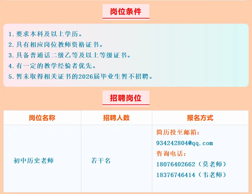 根据2026年春季学期我校教育教学需要,现向社会公开招聘编外教师。我校拟招初中历史顶岗教师若干名。工资待遇按江南区政府事业单位临时聘用人员工资标准:无职称3100元/月,初级职称3200元/月,中级职称3500元/月,高级职称3700元/月,其他班主任津贴(5元/生·月)、年度绩效(1000-1200元/年)和参与学校管理工作量发放(有五险一金)。学校提供免费住宿。 报名实行网络形式,有意者请将简历投至学校邮箱934242804@qq.com。具体面试时间电话通知。来源链接: