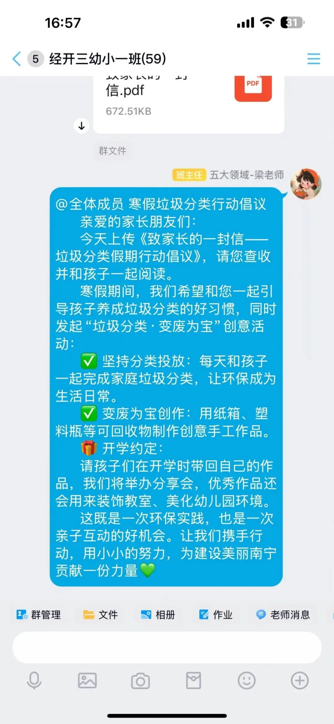 在寒假前的散学典礼上,我园组织全体师幼开展了生活垃圾分类主题宣传活动。通过趣味动画、互动问答、情景模拟等幼儿喜闻乐见的形式,向孩子们普及了垃圾分类的意义、可回收物/厨余垃圾/有害垃圾/其他垃圾的分类标准及投放要求,让环保理念在幼儿心中生根发芽。同时,通过班级群向全体家长发放《致家长的一封信——垃圾分类假期行动倡议》,明确寒假期间垃圾分类实践要求,倡议家长与幼儿共同完成家庭垃圾分类,引导幼儿养成环保习惯。