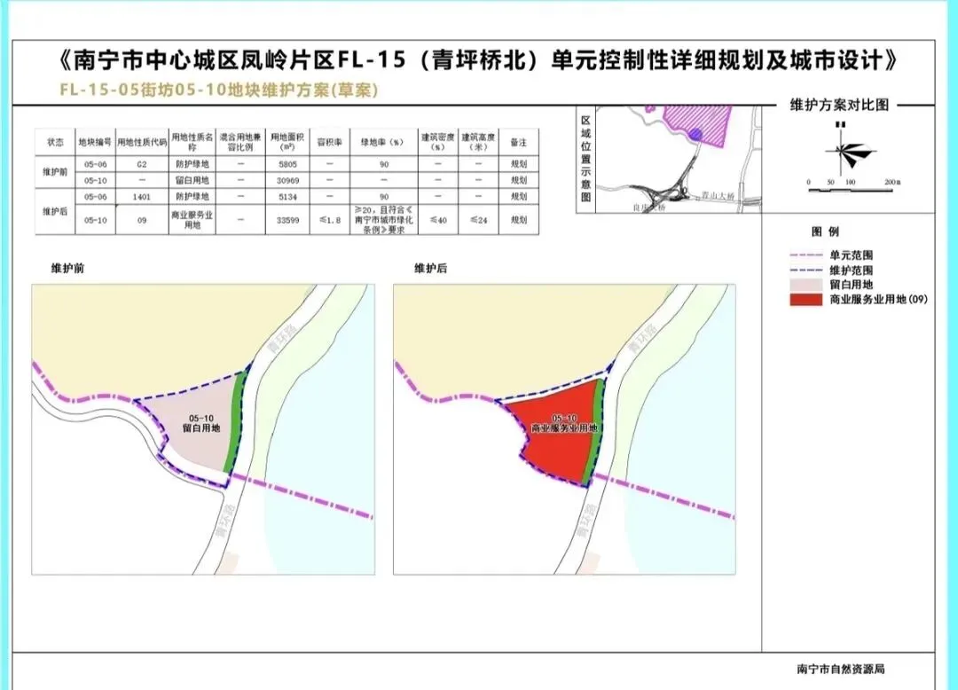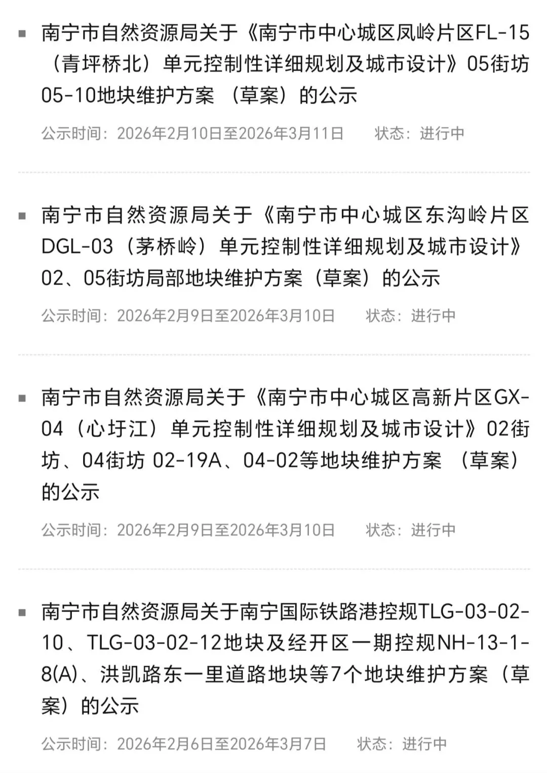 据南宁市自然资源局发布,包括江南区沙井片区、五象新区龙岗南片区、良凤江森林公园友谊路南片区、凤岭片区FL—15(青坪桥北)、仙葫西片区XHX-04(三岸)、东沟岭片区DGL-03(茅桥岭)等单元控制性详细规划修编及维护方案(草案)公示。