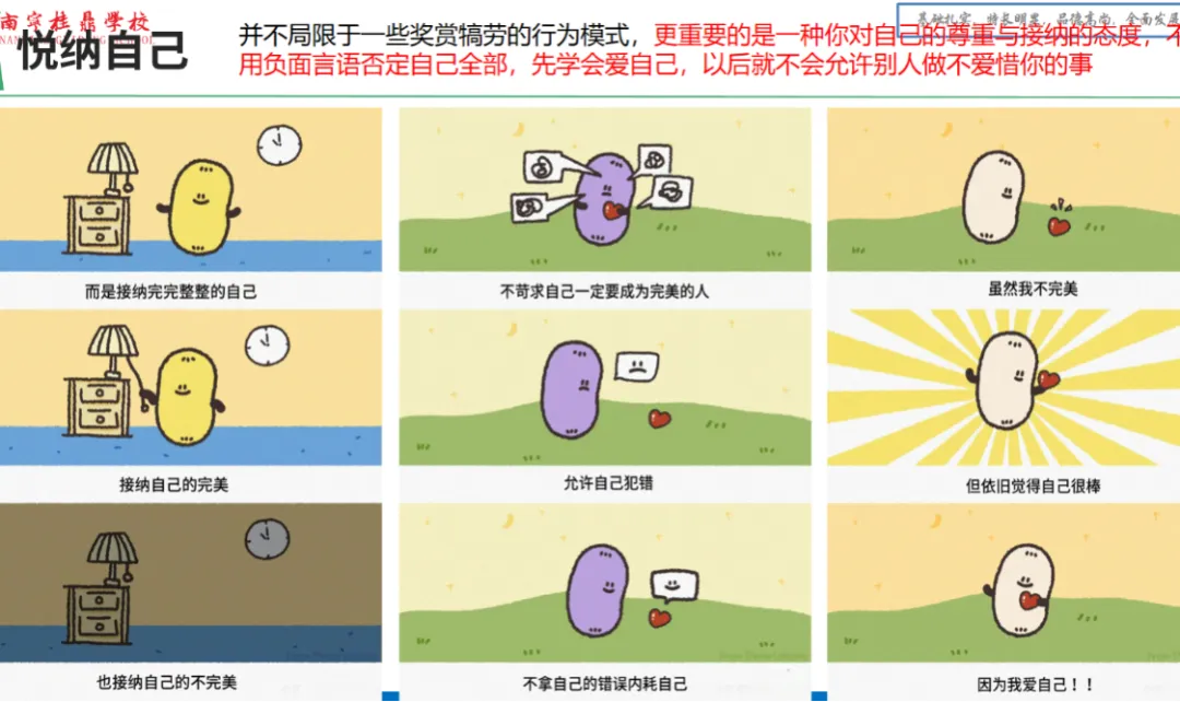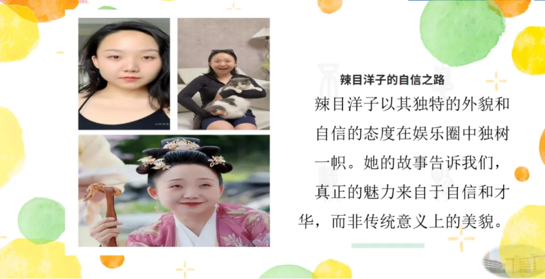 关于自我接纳,她通过辣目洋子、徐志胜等人的故事,引导女生正视不完美,“悦纳自己,像对朋友一样对待自己”。