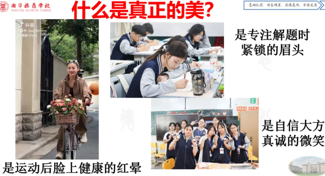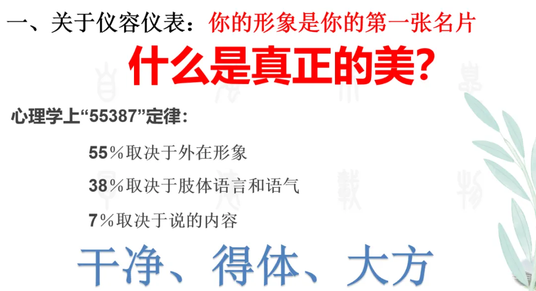 关于仪容仪表,明确年级组的要求,并引用心理学“55387”定律告诉女生:干净、得体、大方才是最美的形象,“书香是最好的香水,自信是最好的腮红”。