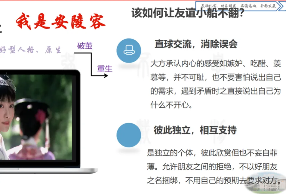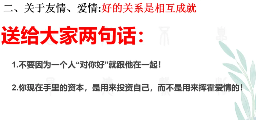 关于人际关系,她剖析《甄嬛传》中的人物性格,教会女生如何化解友谊困扰、识别真假友情,“好的关系是相互成就,而不是彼此捆绑”。更是强调与异性之间保持距离。