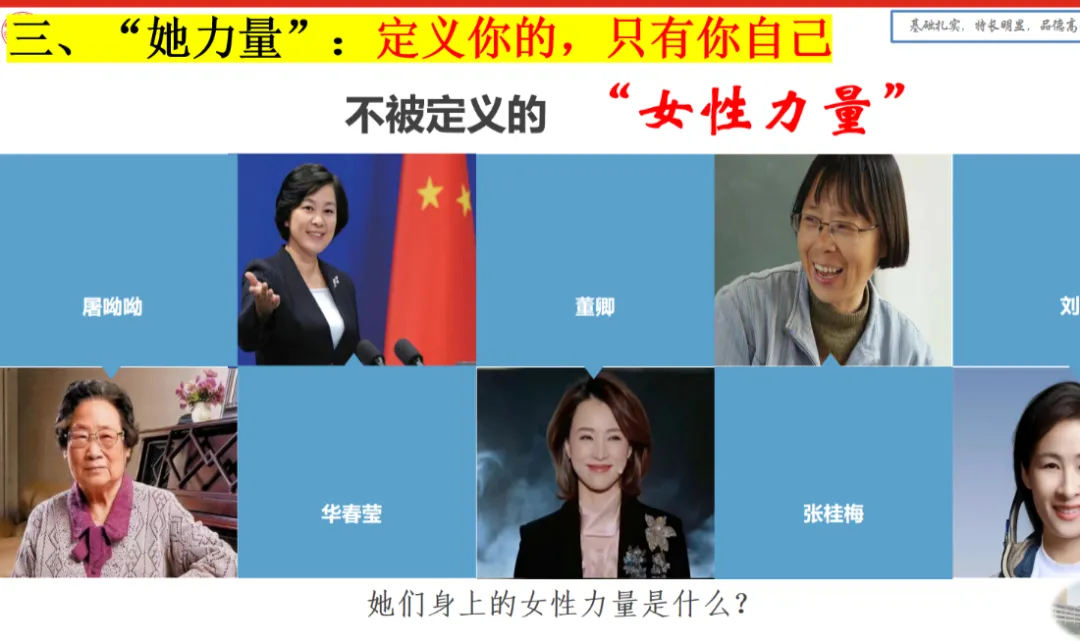关于女性力量,她展示张桂梅、屠呦呦、华春莹等杰出女性的照片,鼓励女生:“定义你的,只有你自己。”