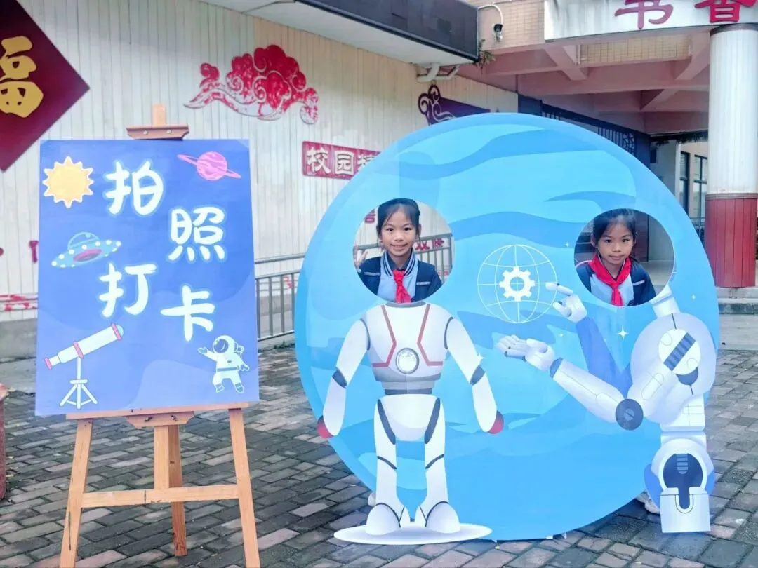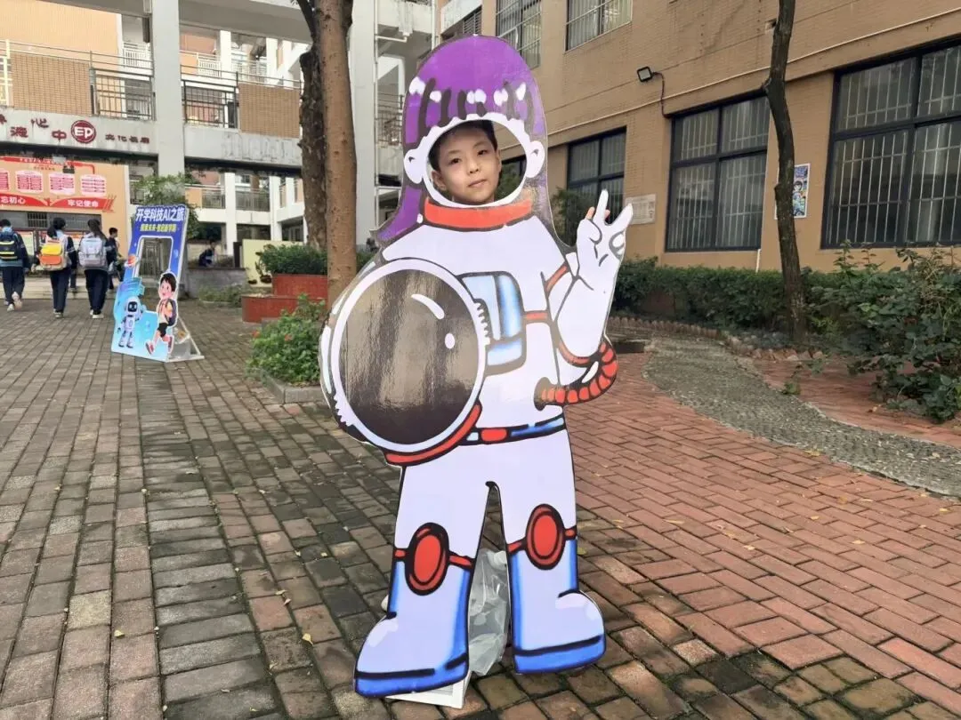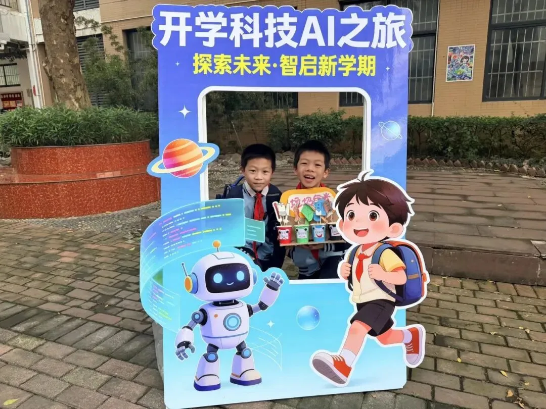 校门口,孩子们踮着脚尖围上前与人形 AI 机器人“萌宠”击掌互动,然后蹦蹦跳跳穿过“科技强国 筑梦未来” 拱门,举着 “AI 小达人”“强国有我” 手举牌,与宇航员、机器人 KT 板亲密合影,一张张笑脸定格在 “开学科技 AI 之旅” 打卡板上,小脸上流露着对智能科技的好奇与喜爱。