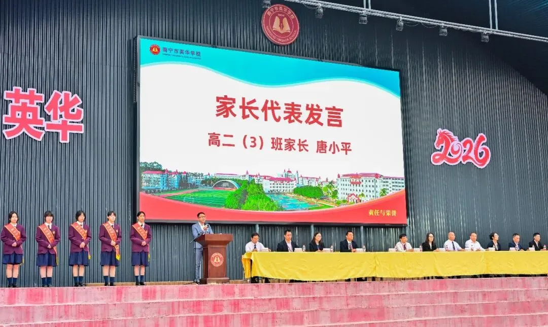 我是英华学校家委会成员,也是高二(3)班唐英杰同学的家长——唐小平。今天能代表家长站在这里,和大家分享心得、说说心里话,我感到既高兴又激动,也倍感荣幸。