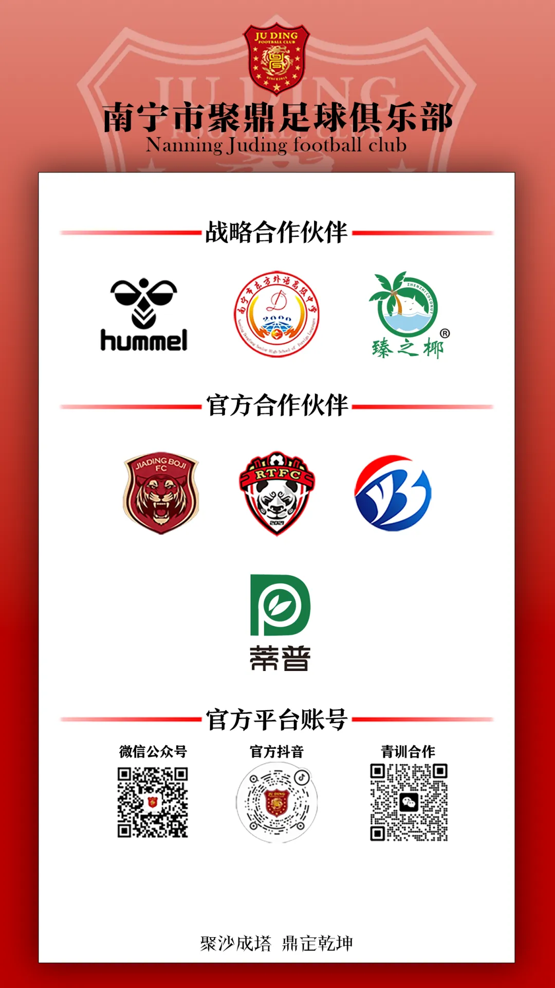 南宁市聚鼎足球俱乐部成立以来,专注青训,从小抓起,我们有完整的足球晋升路线和最职业的执教团队,我们传授的是健康科学的足球思维理念。聚鼎只是孩子足球梦开始的地方!过去的十年里,在所有教练员、工作人员的努力下,经历了一系列职业赛事,从一线执教到后勤补给全部得到了历练,从青训到职业,我们做全做足,完整的各年龄梯队建制,0基础学员的实操、理论把控等。我们坚持把先进的理念,成熟的技术带给对足球依然有梦的孩子们!俱乐部成立后在市、区及中国足协举办的比赛中都取得了亮眼的成绩:连续五年蝉联南宁市千里杯冠军,2022年中国青少年足球联赛总决赛男子U17组全国24强,2024年广西青少年足球协会杯甲组冠军,2025年百耀杯U10组冠军,2026年柳沙杯U12组冠军,柳州富博杯亚军,2026年广西青少年足球锦标赛甲组亚军等优秀成绩。同时为了提高队员竞技水平,俱乐部常年组织参加广西足球超级联赛,中国足球协会杯(中国足协杯)、中国足球协会会员冠军联赛(中冠)等一系列重要赛事。