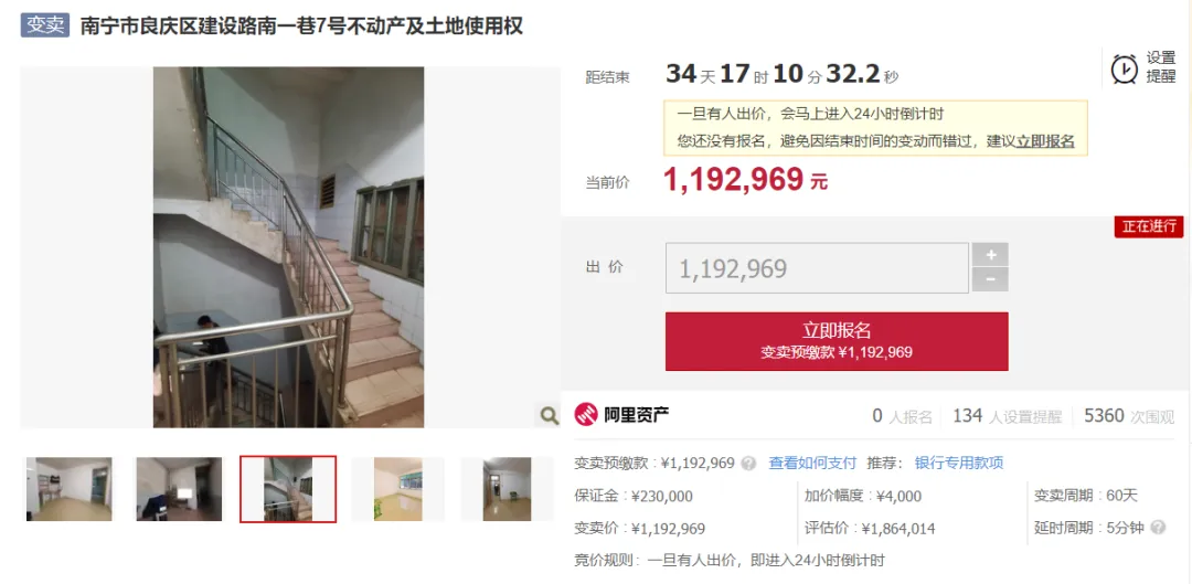 昨天写了一篇也是良庆区的房子拍卖,起拍价只要56万,现在已经加价到80多万了,竞拍还没结束,加价也没结束。作为成熟片区,这个区的房子相对要便宜些,因为这个片区城市界面相对而言会显得旧一点,自建房较多,高端配置没有其他区多。目前又有良庆区的一处房子拍卖,也是自建房,这个房子的具体位置是南宁市良庆区建设路南一巷7号,有兴趣的可以去看看。先来介绍一下这套房的大致情况,房子的土地使用权面积是72平,房屋的建筑面积是473平,一共6层,层高大概3.2米,1999年自建的,距离现在也已经27年了,有相当的历史了。前面说了,这个片区很多自建房,周边配套也相当成熟,交通的话很便利,距离2号线建设路站C口也就7 8百米,相当近,走路也就十来分钟。公交车就更不用说了,老人出行也很方便,如果是自己开车,这里紧邻建设路以及金象大道还有银海大道,也甚是便捷。买房比较关注学区,这里的话距离大沙田小学大概800米的样子,阳光新城小学部差不多1公里,初中有良庆区团结学校,这个大约600米,远一点的有四十四中,大概1.2公里的样子。幼儿园就不用说了,周围很多,可以根据自身情况选择。还有就是医疗以及商业配套设施,社区医院以及药店离得都很近,一家二甲医院在一公里内,南宁市第二人民医院五象医院在2公里左右。商场超市也不少,一般居民区不用太担心超市购物这些,尤其这类成熟片区,不管是买菜还是其他购物,都非常方便。说完了配套设施咱来说说这房子本身情况,因为房龄已经26 7年了,不管是造型还是装修都显得老旧,不管是从外面看还是里面看,都是这种感觉。目前房子没有带租赁,也就是说是房主一家人住着,目前还没有腾房,但已经签署了腾空承诺书。房子的空间足够大,一共六层,虽说装修是简装,但如果收拾出来,看着也挺宽敞明亮的。最关键的是这个包含了地皮,是与房子一并转让拍卖的,这也是这套房能出价到119万的关键原因。不过呢,即便这样,这房子带这次已经是第三次拍卖了,一拍时的起拍价是149万,无人报名而流拍,二拍同样流拍,直到这次变卖。目前拍卖已经开始,但依旧无人报名出价,看来带地皮的6层楼只要119万也不香了,可能在一些人看来,这个钱在青秀区买一套楼梯房或许更香。