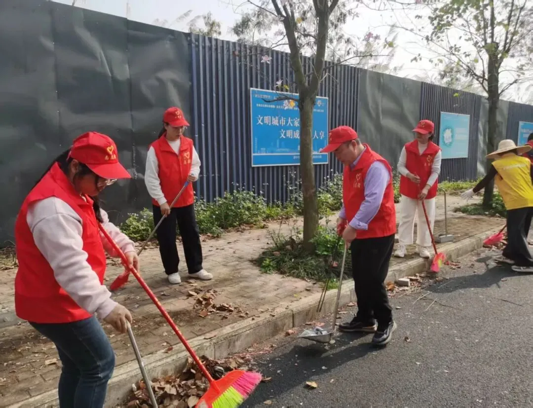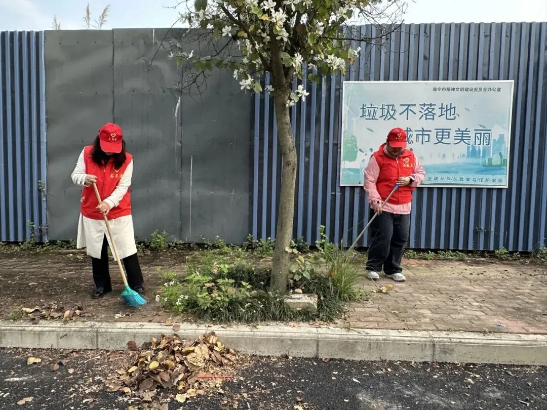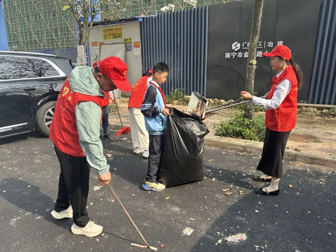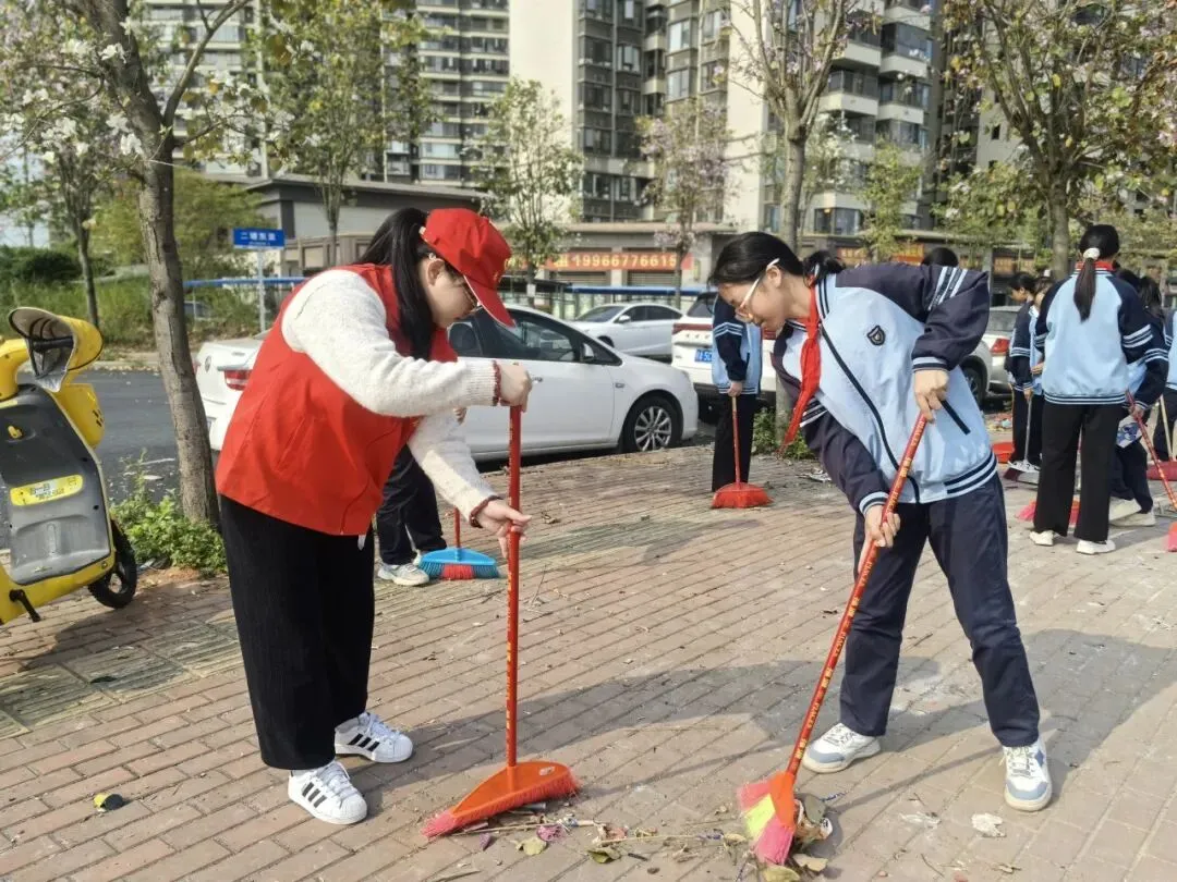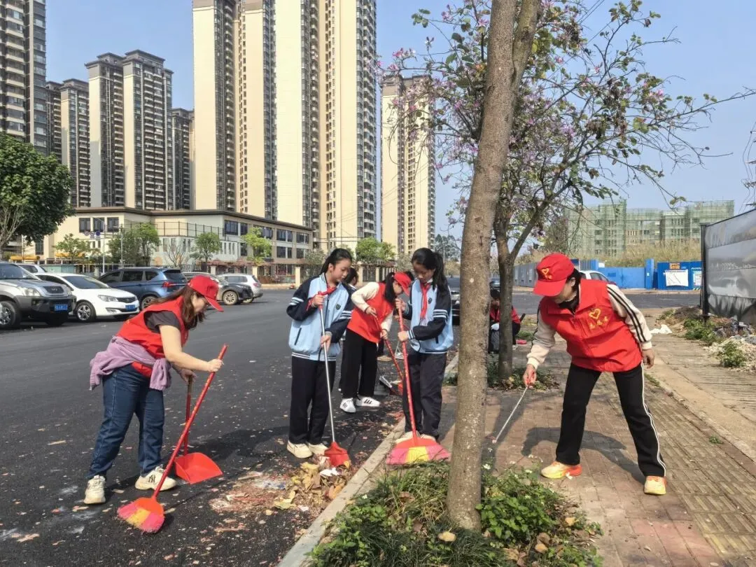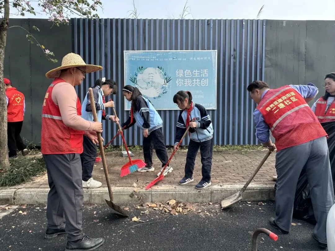 在社区工作人员的指导下,志愿队伍迅速分工、有序行动。党员教师带头拿起清洁工具,认真清扫社区路面杂物、捡拾绿化带内的垃圾、去除墙面小广告,不落下社区任何一处卫生死角。