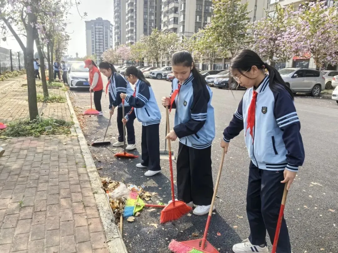 团员代表主动引导少先队员共同开展服务,他们干劲十足,认真铲除路面顽固污渍,合力将清扫出的垃圾倒进垃圾袋,用真诚服务让社区街道焕发新颜。