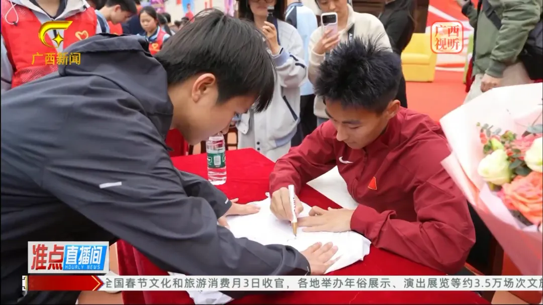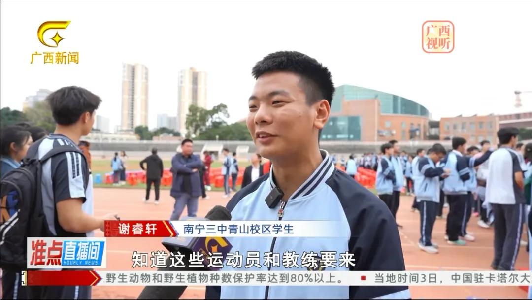 3月3日,“扬冠军拼搏之志,育时代栋梁之才”冠军进校园活动在南宁市第三中学青山校区举办。广西田径运动发展中心特邀冠军林雨薇、广西田径队总教练陈文忠以及国家队现役运动员谢震业、曾克理、陈佳鹏来到现场,与师生们进行面对面交流。