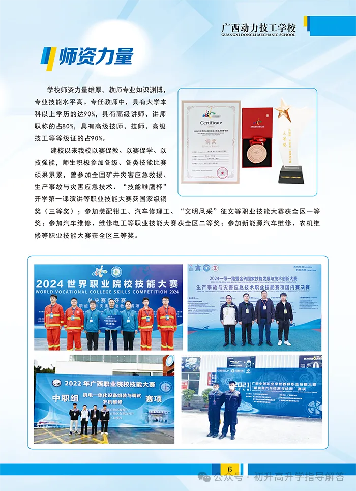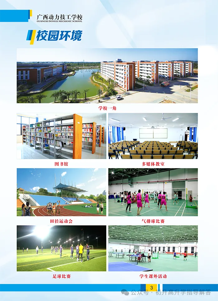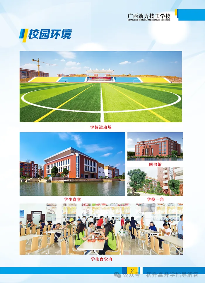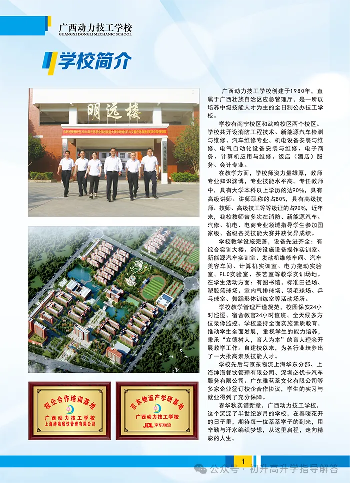 学校有南宁校区和武鸣校区两个校区。学校共开设消防工程技术、新能源汽车检测与维修、汽车维修专业、机电设备安装与维修、电气自动化设备安装与维修、电子商务、计算机应用与维修、饭店(酒店)服务、会计专业。在教学方面,学校师资力量雄厚,教师专业知识渊博,专业技能水平高。专任教师中,具有大学本科以上学历的达90%,具有高级讲师、讲师职称的占80%,具有高级技师、技师、高级技工等等级证的占90%,近年来,我校教师曾多次在消防、新能源汽车、汽修、机电、电商专业领域指导学生参加国家级、省级各类技能大赛并获优异成绩。学校教学设施完善,设备先进齐全:有综合实训大楼、消防设施设备操作实训室、新能源汽车实训室、发动机维修车间、汽车美容车间、计算机实训室、电力拖动实验室、PLC实验室、茶艺室等教学实训场地。在学生活动方面:有图书馆、标准田径场、塑胶篮球场、室内气排球场、羽毛球场、乒乓球室、舞蹈形体训练室等活动场所。学校教学管理严谨规范,校园保安24小时巡逻、宿舍教官24小时值班、全天候多方位录像监控。学校坚持全面实施素质教育,推动学生全面发展,重视学生的能力培养,秉承“立德树人,育人为本”的育人理念开展教学工作。自建校以来,为各行业培养出了一大批高素质技能人才,学校先后与京东物流上海华东分部、上海绅海餐饮管理有限公司、深圳必优卡汽车服务有限公司、广东雅茗茶文化有限公司等多家企业签订校企合作协议,学生的实习与就业得到了充分保障。春华秋实谱新章,广西动力技工学校,这个沉淀了半世纪岁月的学校,在春暖花开的日子里,期待每一位莘莘学子的到来,用辛勤与汗水编织梦想,从这里启程,走向精彩的人生。