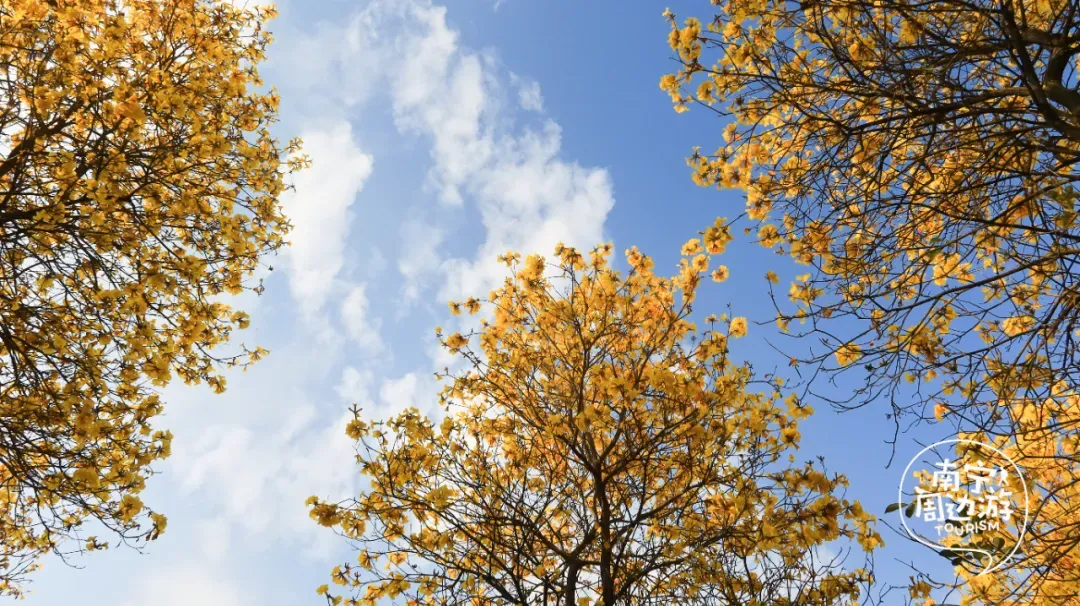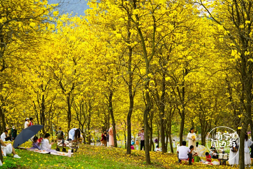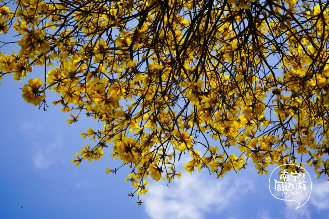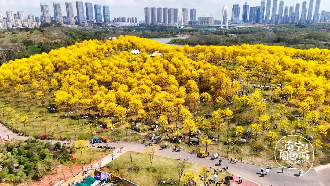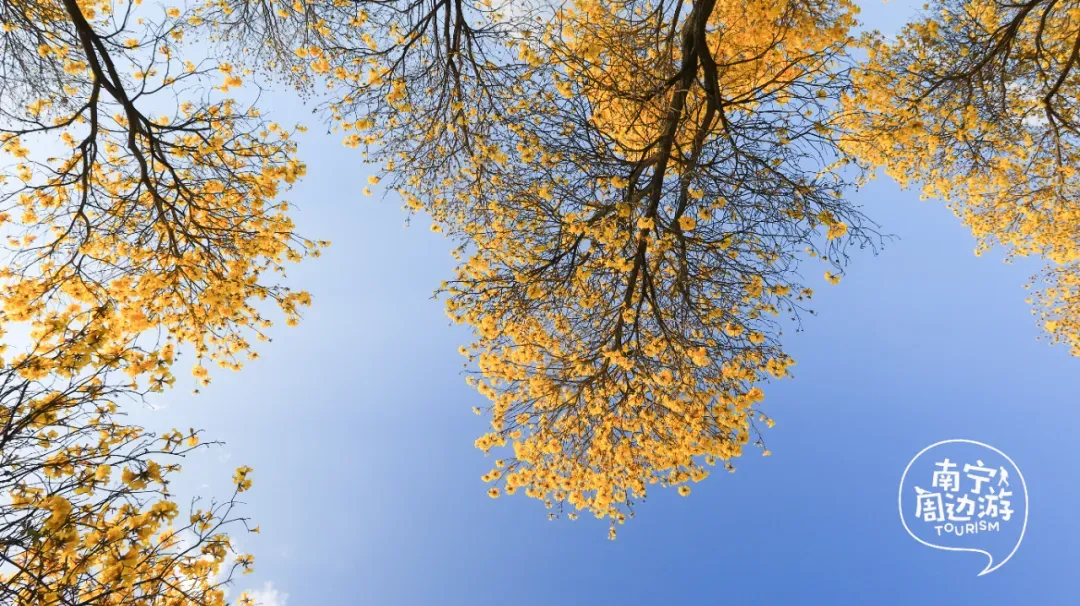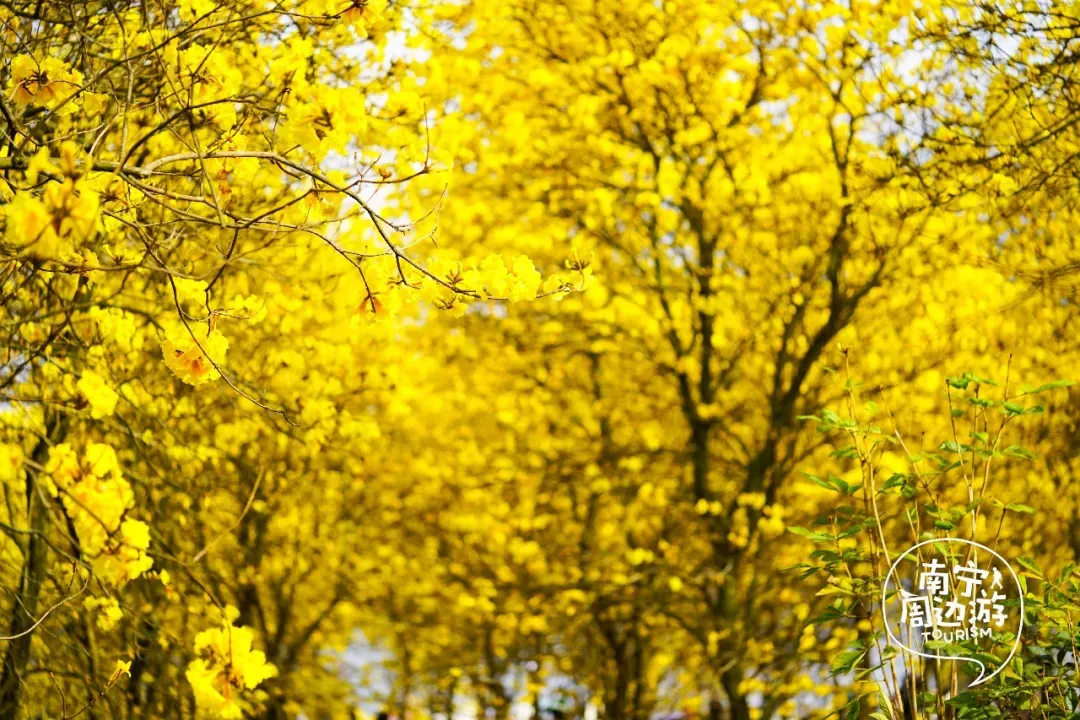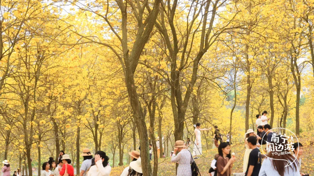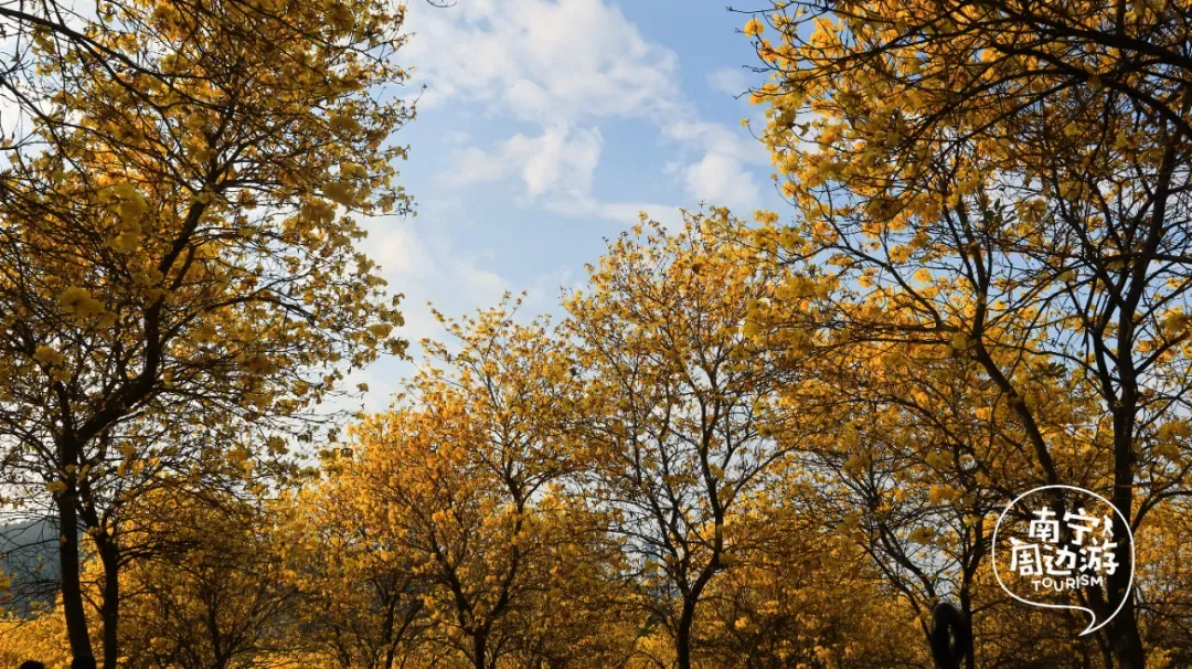 最近,南宁又一片黄花风铃木全面盛开了!这里有五百多亩、上万株的黄花风铃木开满了整个山头!南宁的黄花风铃木,终于迎来了一年中最绚烂的时刻。南宁的黄花风铃木,终于迎来了一年中最绚烂的时刻。蓝天之下,黄花风铃木在这里肆意绽放,满树的金黄热烈而明媚,仿佛把整个春天的阳光都揉碎在了枝头。从地面仰望,树枝向四周伸展,金黄的花朵密密匝匝,在微风中轻轻摇曳,像是无数个金色的风铃在风中作响,诉说着春日的私语。阳光透过枝叶的缝隙洒下,给花瓣镀上了一层柔和的光晕,随手一拍都是绝美的春日大片。换个视角,从高空俯瞰,整片花海如同一幅巨大的金色织锦,铺满了整个山头。找一处花开得最盛的树下,以满树金黄为背景,穿上浅色的衣裙,或站或坐,让花瓣自然地落在身上,氛围感拉满。蜿蜒的小路穿梭在花海之间,游人如织,或驻足欣赏,或漫步其中,与这片金色的海洋融为一体,构成了一幅生动的春日画卷。