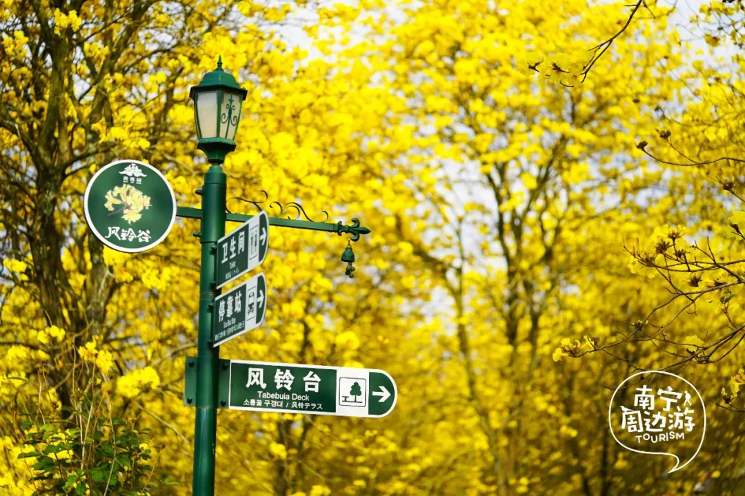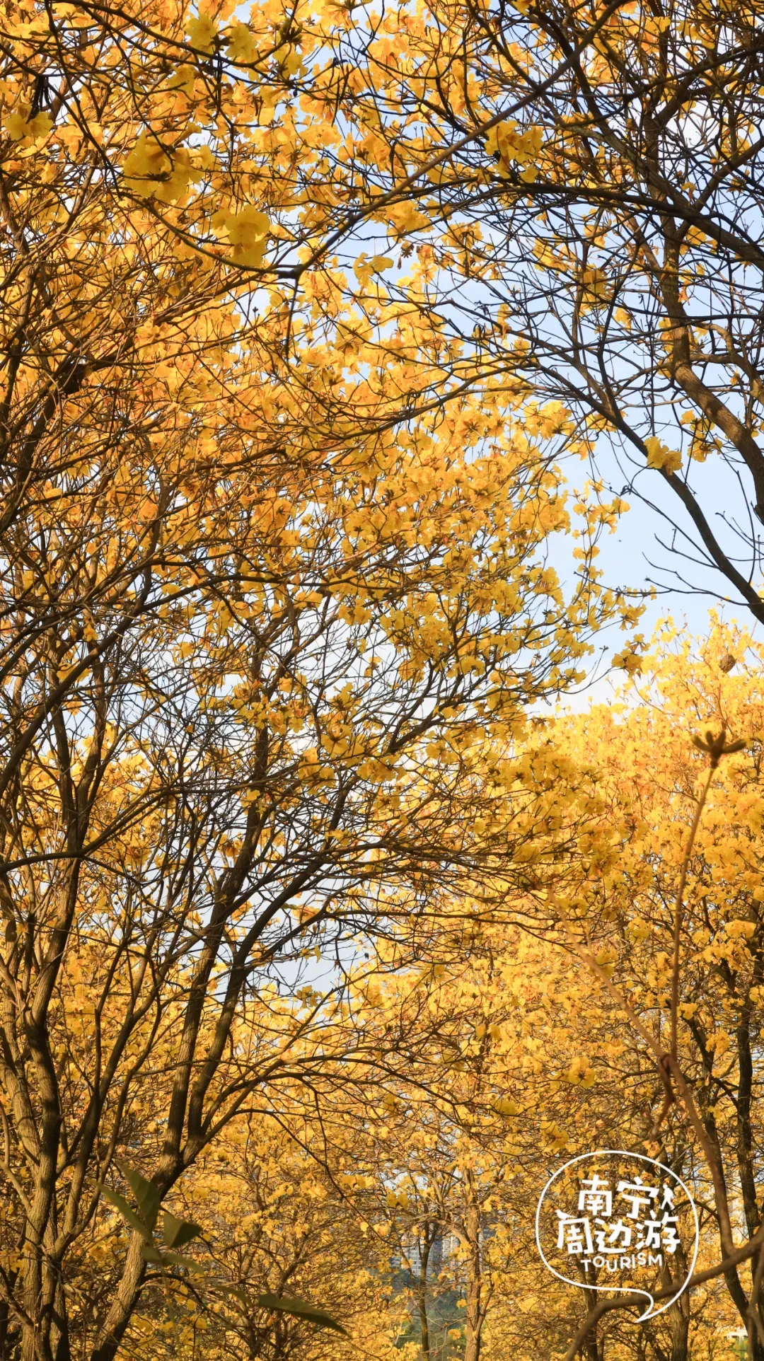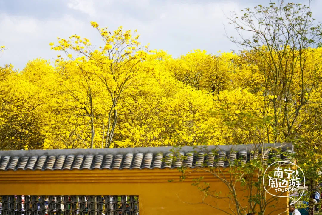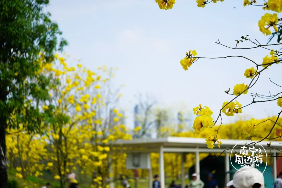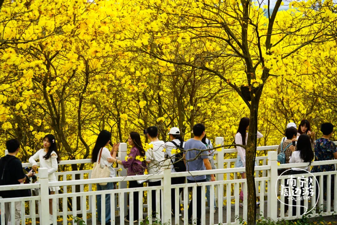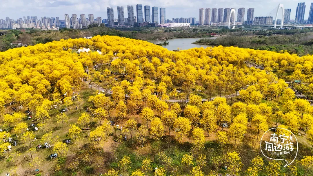 最近,南宁又一片黄花风铃木全面盛开了!这里有五百多亩、上万株的黄花风铃木开满了整个山头!南宁的黄花风铃木,终于迎来了一年中最绚烂的时刻。南宁的黄花风铃木,终于迎来了一年中最绚烂的时刻。蓝天之下,黄花风铃木在这里肆意绽放,满树的金黄热烈而明媚,仿佛把整个春天的阳光都揉碎在了枝头。从地面仰望,树枝向四周伸展,金黄的花朵密密匝匝,在微风中轻轻摇曳,像是无数个金色的风铃在风中作响,诉说着春日的私语。阳光透过枝叶的缝隙洒下,给花瓣镀上了一层柔和的光晕,随手一拍都是绝美的春日大片。换个视角,从高空俯瞰,整片花海如同一幅巨大的金色织锦,铺满了整个山头。找一处花开得最盛的树下,以满树金黄为背景,穿上浅色的衣裙,或站或坐,让花瓣自然地落在身上,氛围感拉满。蜿蜒的小路穿梭在花海之间,游人如织,或驻足欣赏,或漫步其中,与这片金色的海洋融为一体,构成了一幅生动的春日画卷。
