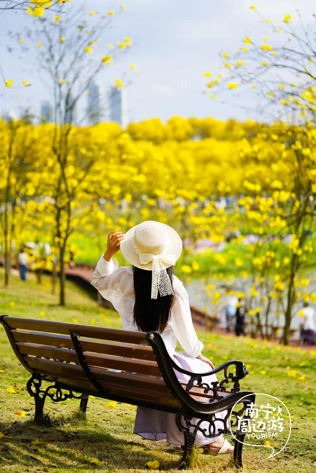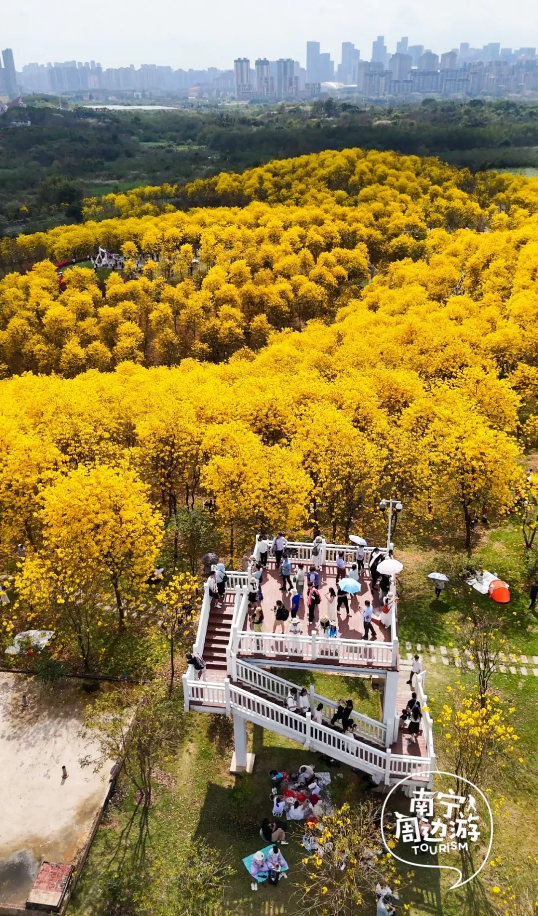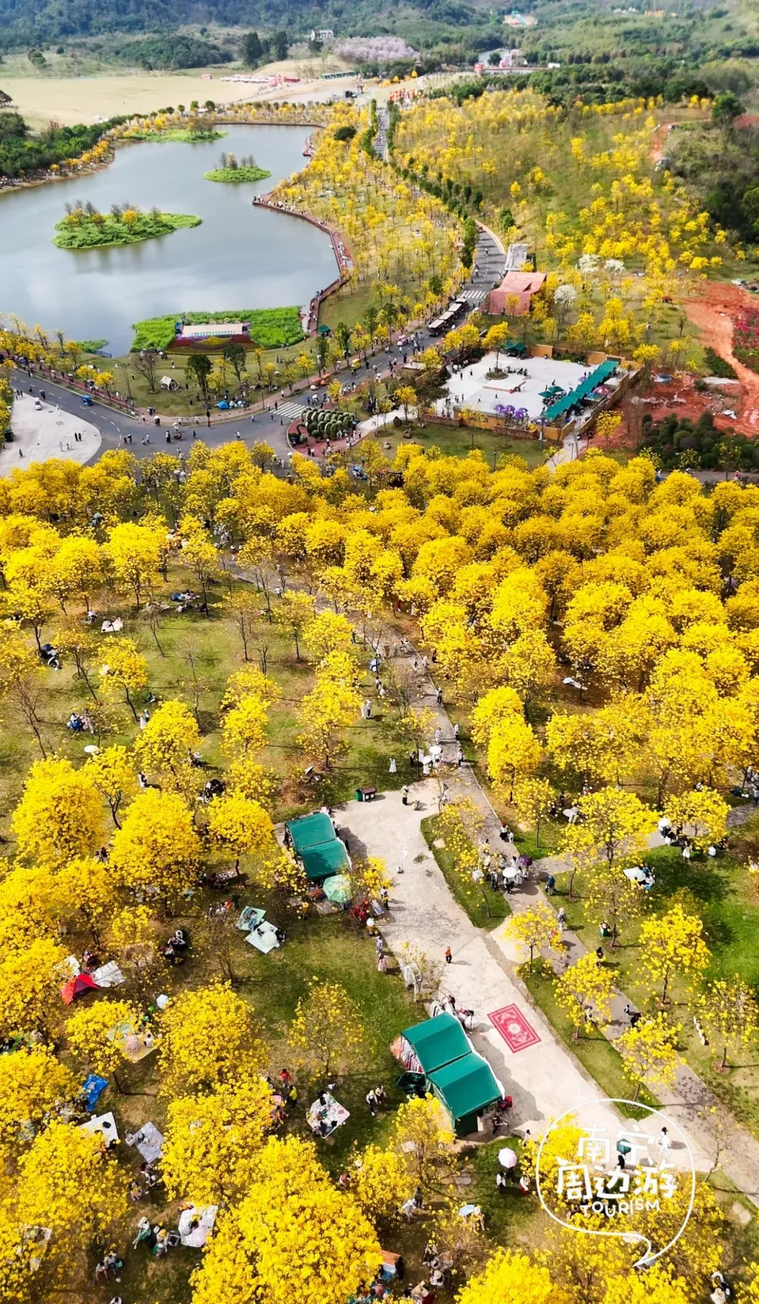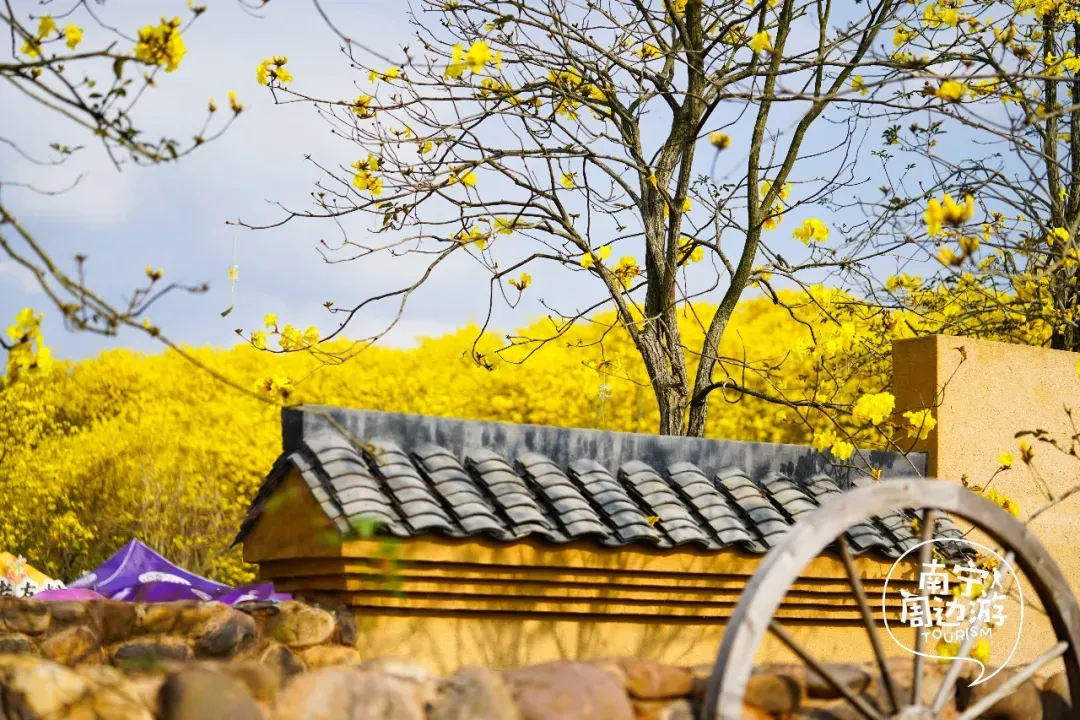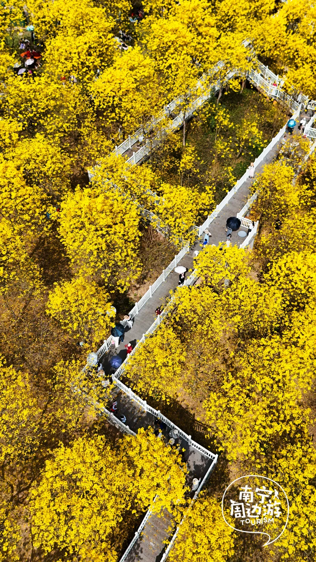 最近,南宁又一片黄花风铃木全面盛开了!这里有五百多亩、上万株的黄花风铃木开满了整个山头!南宁的黄花风铃木,终于迎来了一年中最绚烂的时刻。南宁的黄花风铃木,终于迎来了一年中最绚烂的时刻。蓝天之下,黄花风铃木在这里肆意绽放,满树的金黄热烈而明媚,仿佛把整个春天的阳光都揉碎在了枝头。从地面仰望,树枝向四周伸展,金黄的花朵密密匝匝,在微风中轻轻摇曳,像是无数个金色的风铃在风中作响,诉说着春日的私语。阳光透过枝叶的缝隙洒下,给花瓣镀上了一层柔和的光晕,随手一拍都是绝美的春日大片。换个视角,从高空俯瞰,整片花海如同一幅巨大的金色织锦,铺满了整个山头。找一处花开得最盛的树下,以满树金黄为背景,穿上浅色的衣裙,或站或坐,让花瓣自然地落在身上,氛围感拉满。蜿蜒的小路穿梭在花海之间,游人如织,或驻足欣赏,或漫步其中,与这片金色的海洋融为一体,构成了一幅生动的春日画卷。