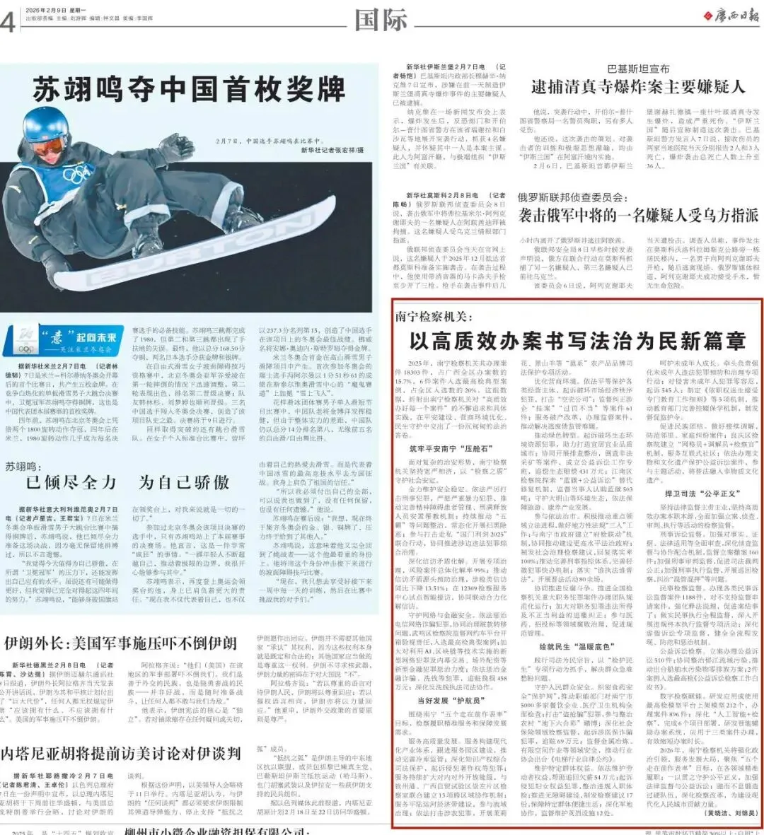 推动绿色转型。起诉破坏生态环境资源犯罪,助力打造宜居宜业品质城市;协同开展排查整治,倒查非法采矿等案件,成立公益诉讼工作专班,追偿生态赔偿431万元;江南区检察院探索“蓝碳+公益诉讼”替代修复机制,监督当事人认购蓝碳503吨;守护大明山等环境生态,依法保障旅游、康养产业发展。