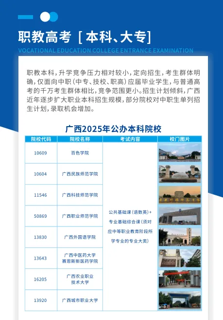 升学优势:学校高度重视学生的成长和发展,以升学为导向,就业相结合,学校设有“升学班”,学生参加职教高考,可升读广西区内的大专、本科院校。