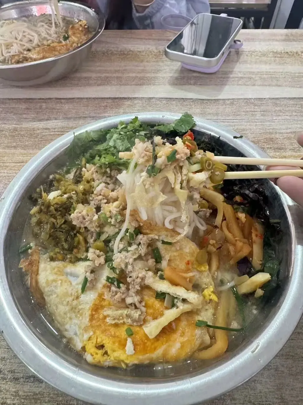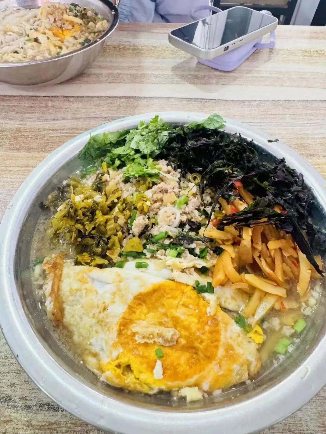 粉一端上桌,我看到7块钱的分量真是太实在了!生榨粉特有的微酸香气扑鼻而来,面上铺满了紫菜、碎肉、酸菜和香菜,旁边还卧着一个煎得金黄焦香的荷包蛋。把丰富的配菜和软糯的米粉一拌,跐溜一大口,酸爽开胃,满嘴都是料,越吃越过瘾!