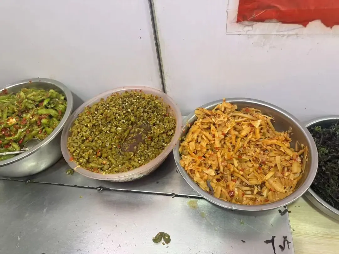 一进店,我就被他家的配料台惊艳到了!好几个大铁盆一字排开,酸笋、酸豆角、辣椒圈……满满当当,光看着这配菜阵容就让人狂咽口水。