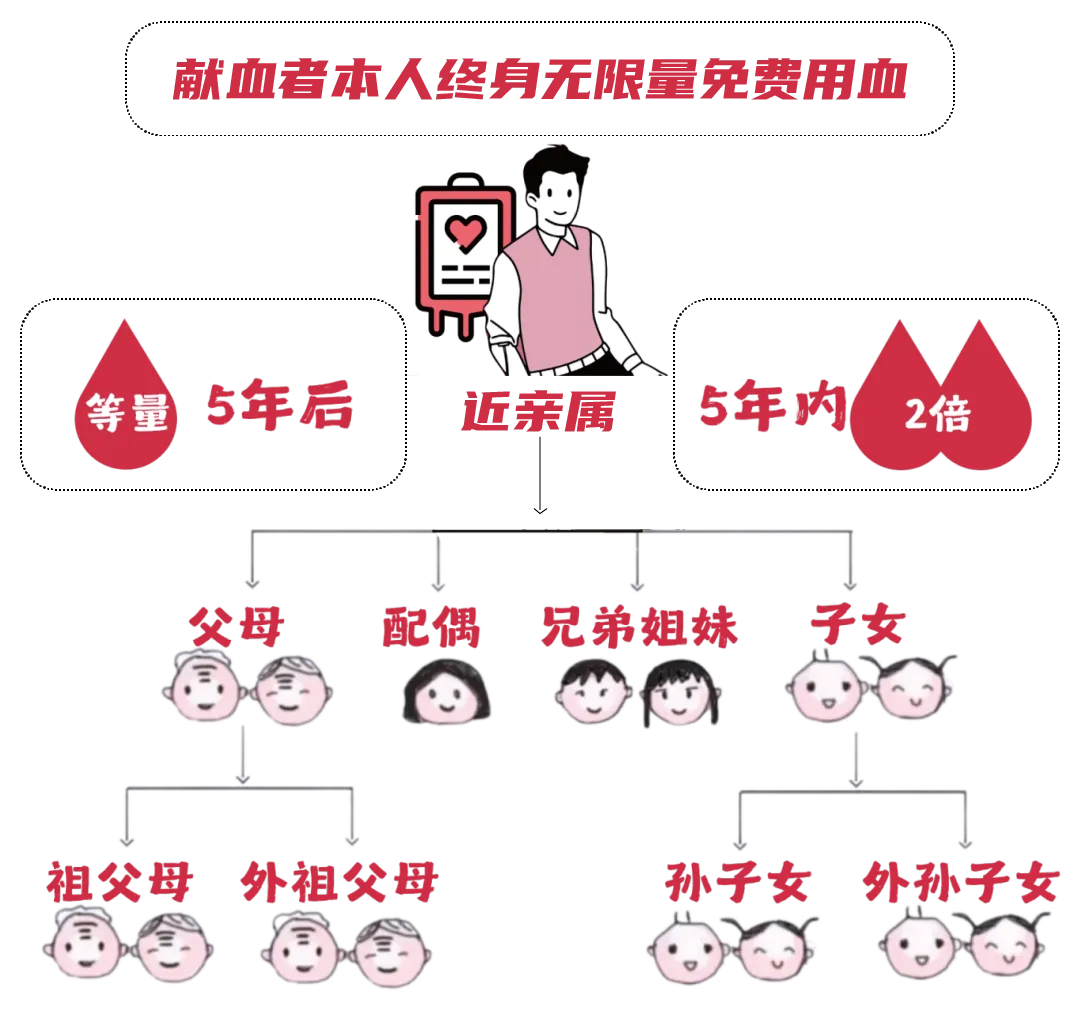 献血者的近亲属自献血者最近一次献血之日起五年内临床用血的,按照献血者既往献血总量的两倍免交费用;