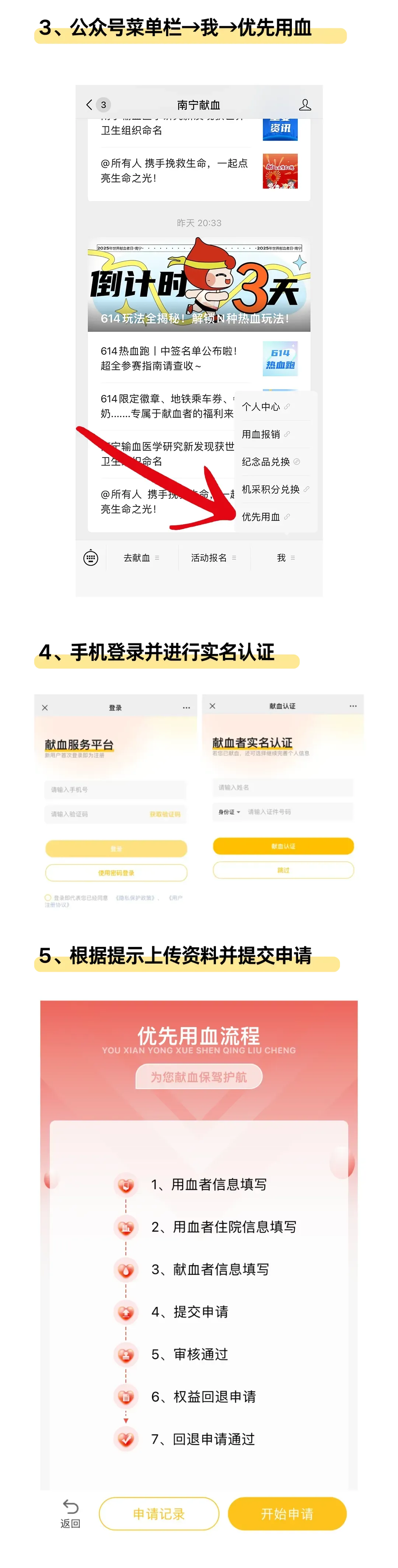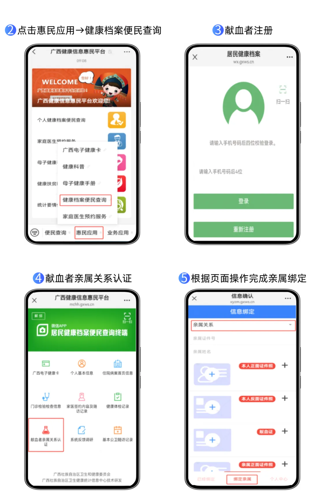 需献血者先授权确认。住院期间在微信搜索“广西健康信息惠民平台”关注微信公众号,绑定可免费用血的近亲属。绑定成功后,出院结算时系统可自动识别亲属关系,办理用血直免,减免费用原路返还至缴费账号或现金支付减免费用。