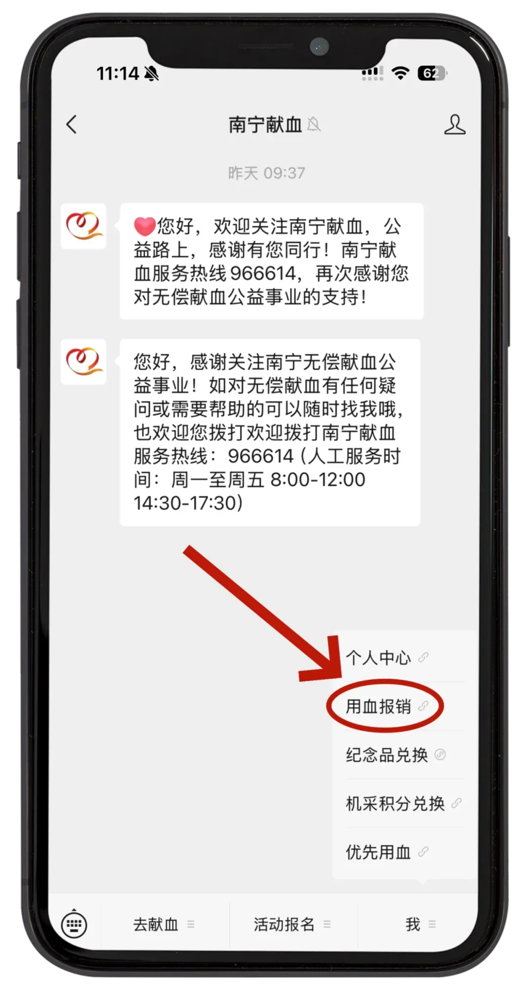点开南宁献血公众号聊天框,点击右下方菜单栏【我】→【用血报销】,根据提示上传用血报销相关资料。