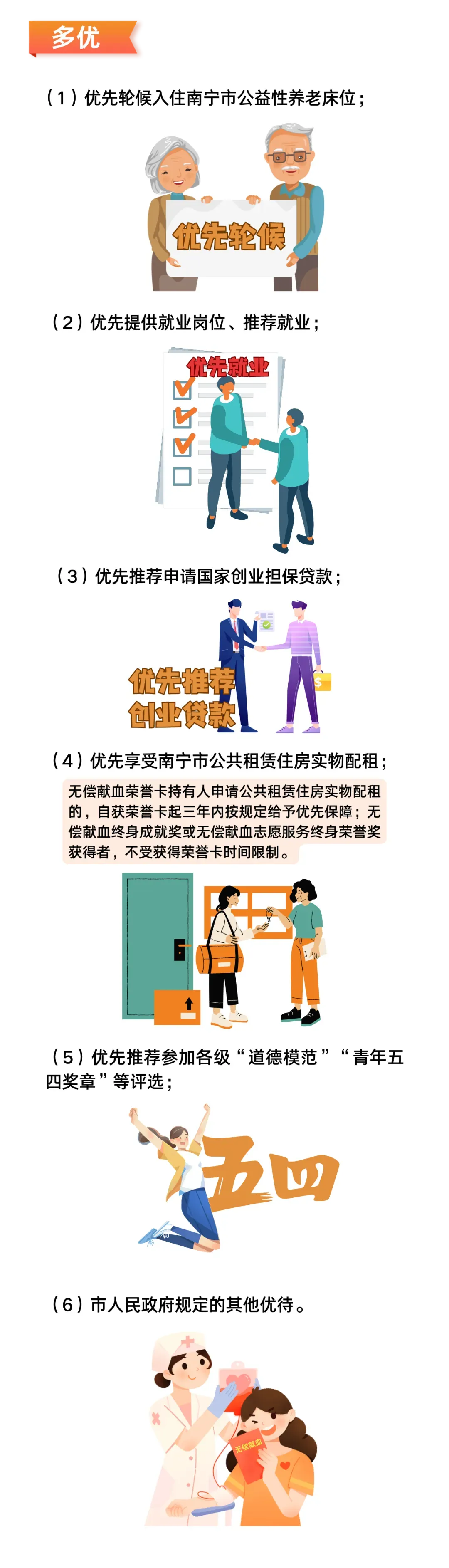 也就是说,只要在南宁市参加无偿献血,除了献血者本人,献血者的配偶、子女、父母、兄弟姐妹、祖父母、外祖父母、孙子女、外孙子女均可享受优先用血、血费减免优待政策。