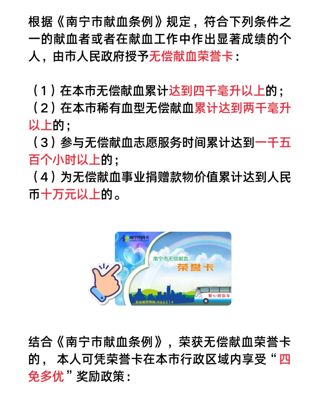 《南宁市献血条例》明确,南宁市献血者及其近亲属临床用血的,除医疗急救用血外,医疗机构予以优先保障且按照相关规定,减免血液的采集、储存、分离、检验等费用。