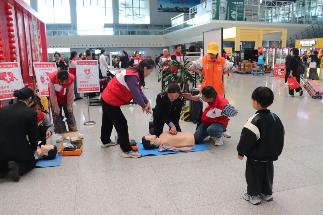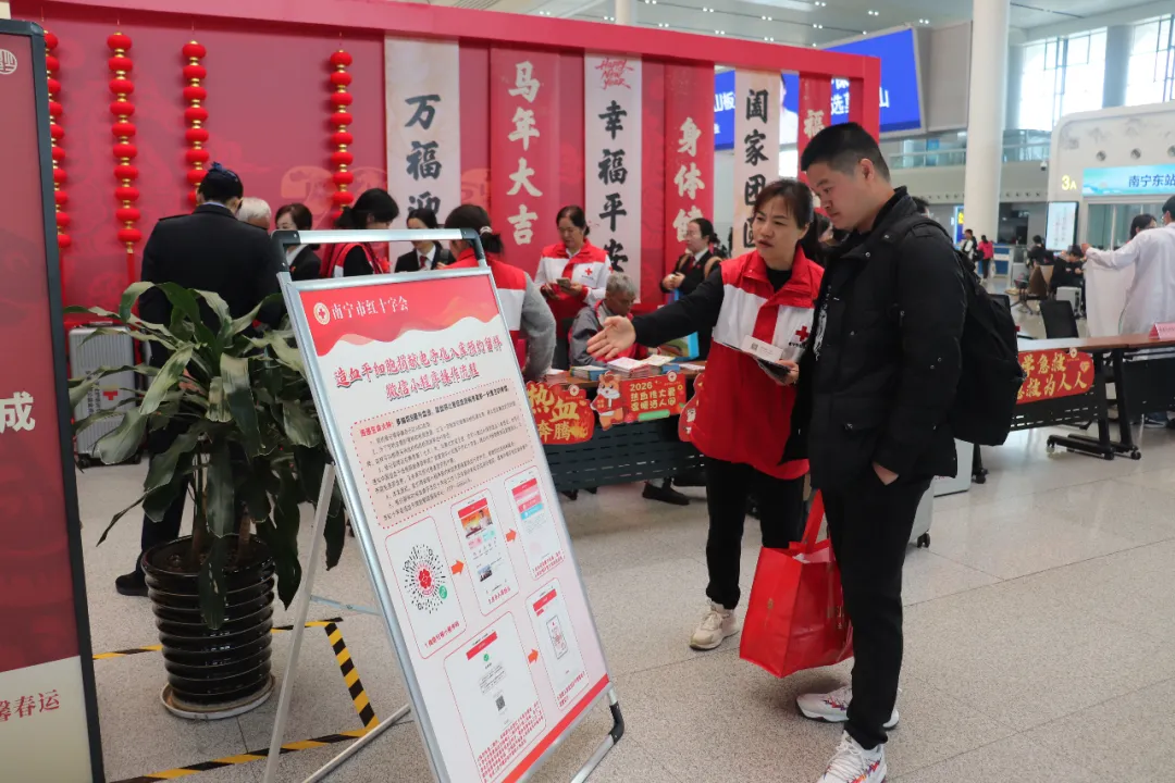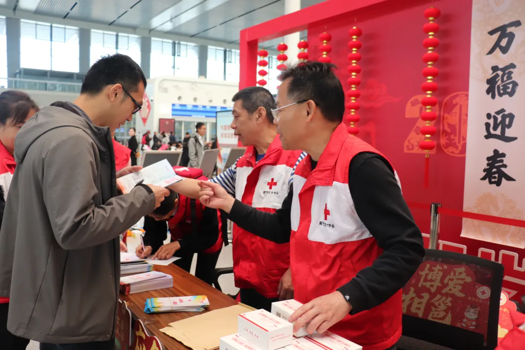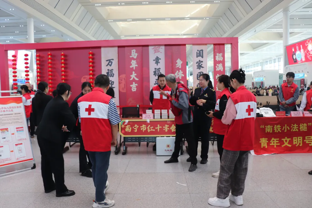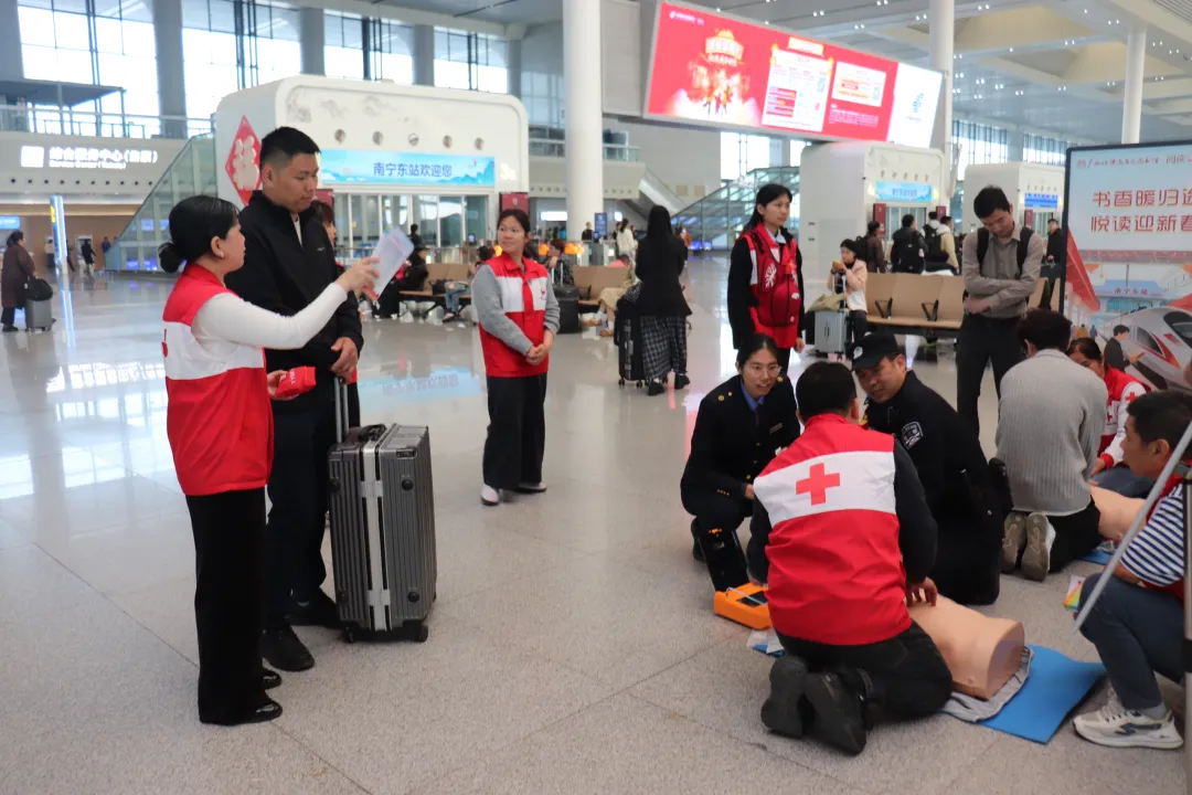 活动现场温情满满、氛围热烈,恰逢春运返程客流高峰,往来旅客络绎不绝,身着红十字马甲的南宁市红十字会工作人员和志愿者们为旅客们提供红十字知识科普和急救宣传,成为候车区里最亮丽的风景线。