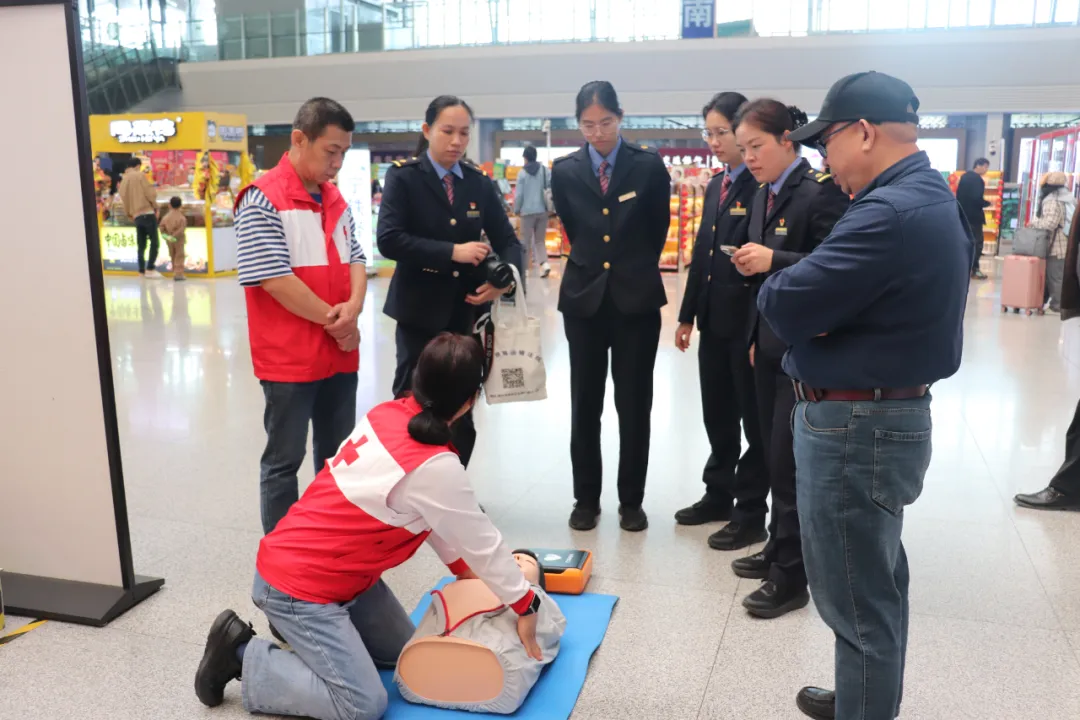在应急救护科普宣传区,南宁市红十字会应急救护师资团队现场开展沉浸式急救技能宣讲。师资团队通过模拟演示、一对一教学的方式,向旅客和车站工作人员详细讲解心肺复苏(CPR)、气道异物梗阻(海姆立克急救法)等实用应急技能,手把手指导大家进行实操体验,耐心纠正动作规范,让大家在互动中掌握自救互救技巧,也进一步提升候车旅客的应急防护意识,筑牢春运出行安全防线。