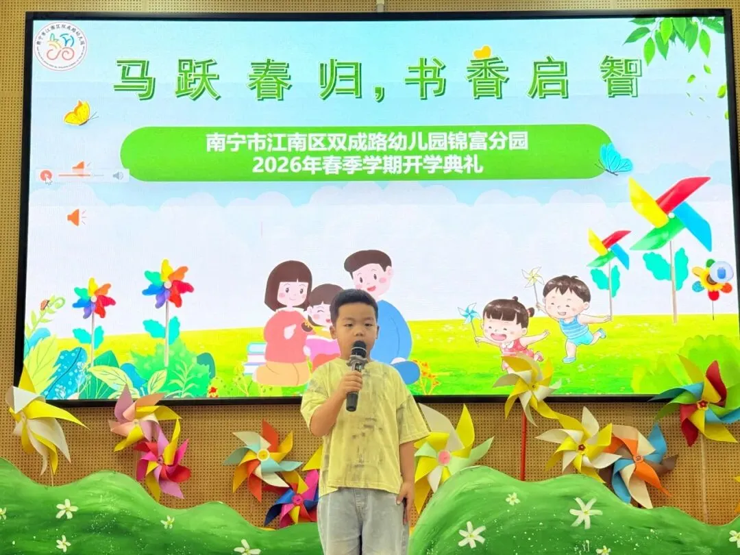 大班的家旭小朋友作为幼儿代表,自信地站上舞台,用稚嫩却坚定的声音,分享了自己的新学期心愿。他还号召小伙伴们,新学年要像小马一样勇往直前,坚持阅读、认真学本领,和好朋友们一起在幼儿园收获成长,遇见更好的自己。