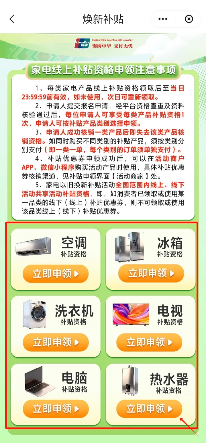 个人消费者购买冰箱、洗衣机、电视、空调、电脑、热水器等6类家电中1级能效或水效标准的产品,按产品销售价格(即商家开具发票所载实际成交价格)的15%给予补贴,每位消费者每类产品可补贴1件,每件补贴不超过1500元。