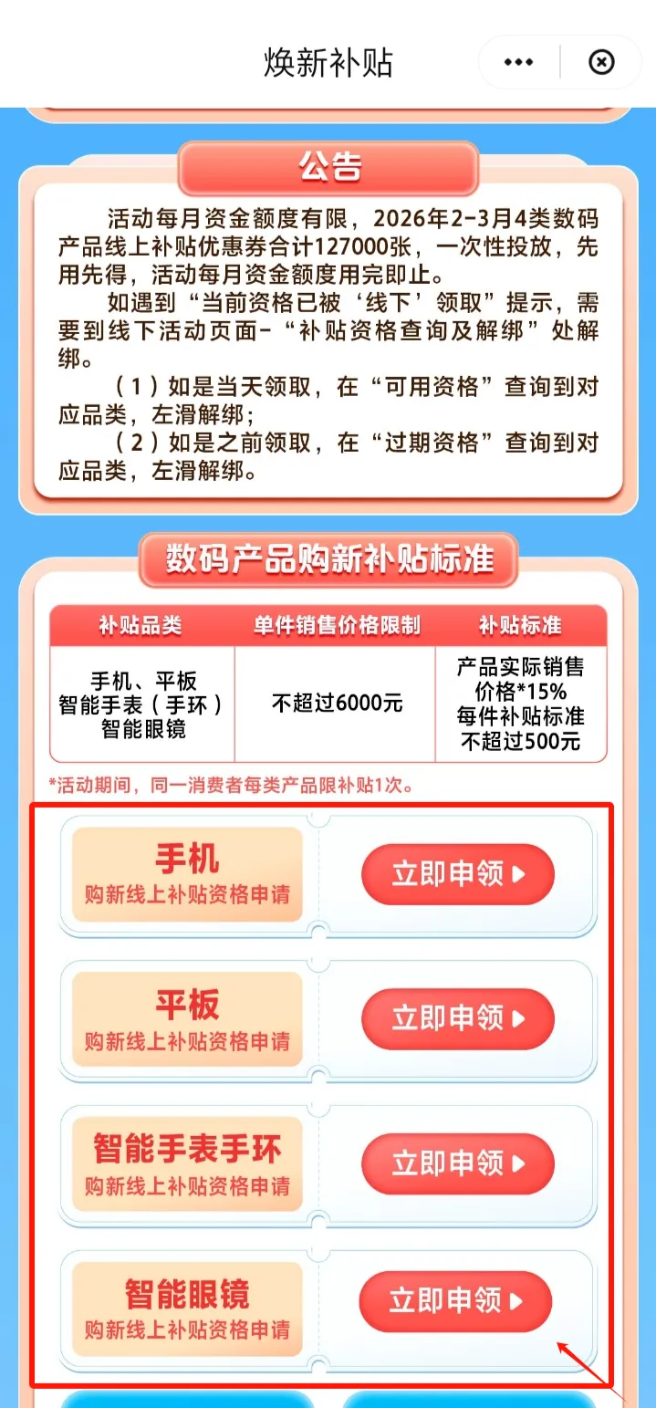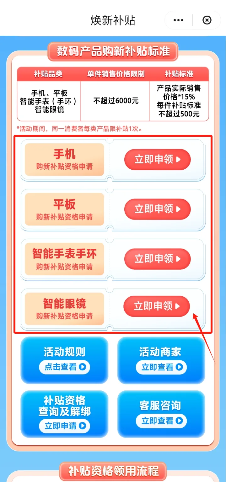 个人消费者购买手机、平板电脑、智能手表手环、智能眼镜等4类产品(单件销售价格不超过6000元),按产品销售价格(即商家开具发票所载实际成交价格)的15%给予补贴,每位消费者每类产品可补贴1件,每件补贴不超过500元。
