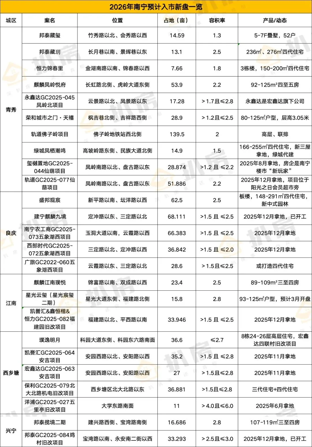据不完全统计,2026年南宁楼市预计有25个新盘入市,涵盖刚需、改善、豪宅,任君挑选。