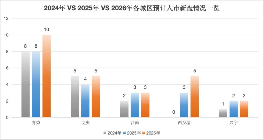 不完全统计,2026年青秀新盘最多,达10盘;良庆、西乡塘旗鼓相当,为5盘;其他的江南3盘、兴宁2盘。