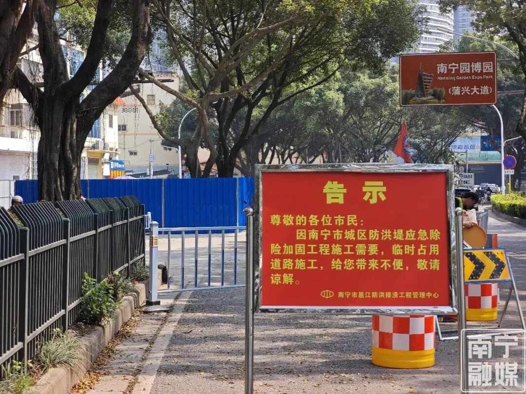 江北大道绿树成荫,树木枝繁叶茂,是许多市民散步时的好去处,生长多年的大树为何移走?在现场,记者看到道路上放置了一块告示牌,内容写明该处因南宁市城区防洪堤应急除险加固工程施工需要,临时占用道路施工。