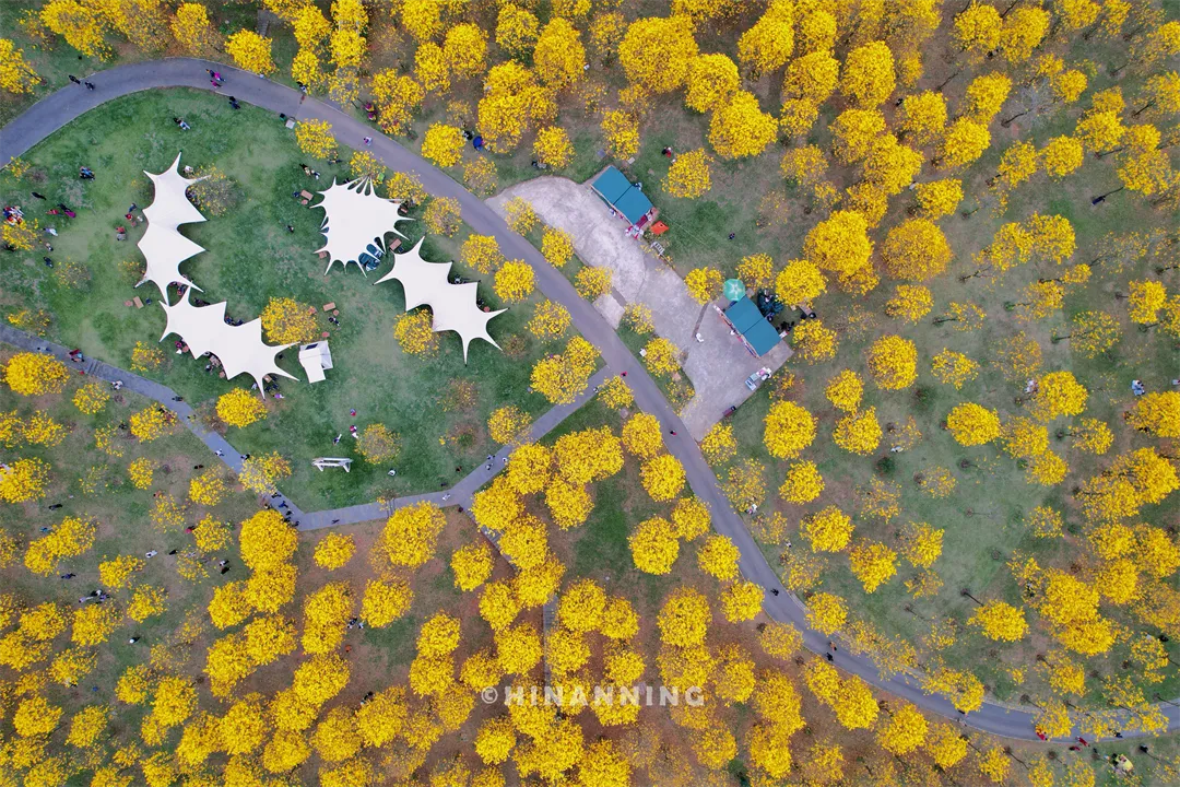 青秀山黄花风铃园就像一个藏在景区东区竹园南面的神秘宝藏,占地约500亩,园内种有上万株黄花风铃木,是南宁市面积最大、景观最佳的黄花风铃木种植地。这里地势得天独厚,站在高处远眺,满树繁花与城市美景尽收眼底。
