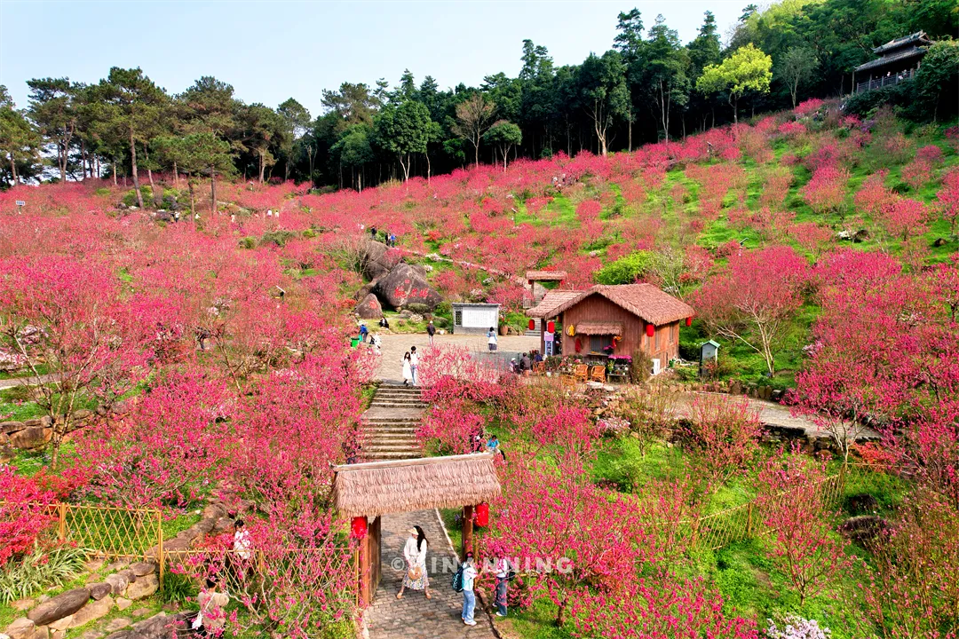 漫步走下台阶,就像走进了一个桃花的童话世界。12万株桃花像一群热情的小仙子,迎春怒放,漫山遍野的粉色花海就像一幅徐徐展开的油画,美得让人陶醉。桃花坞的古朴亭台、桃花岛的蜿蜒石阶,处处都透着浓郁的古风韵味,随手一拍都是雅致大片,就像穿越回了古代的诗意时光。