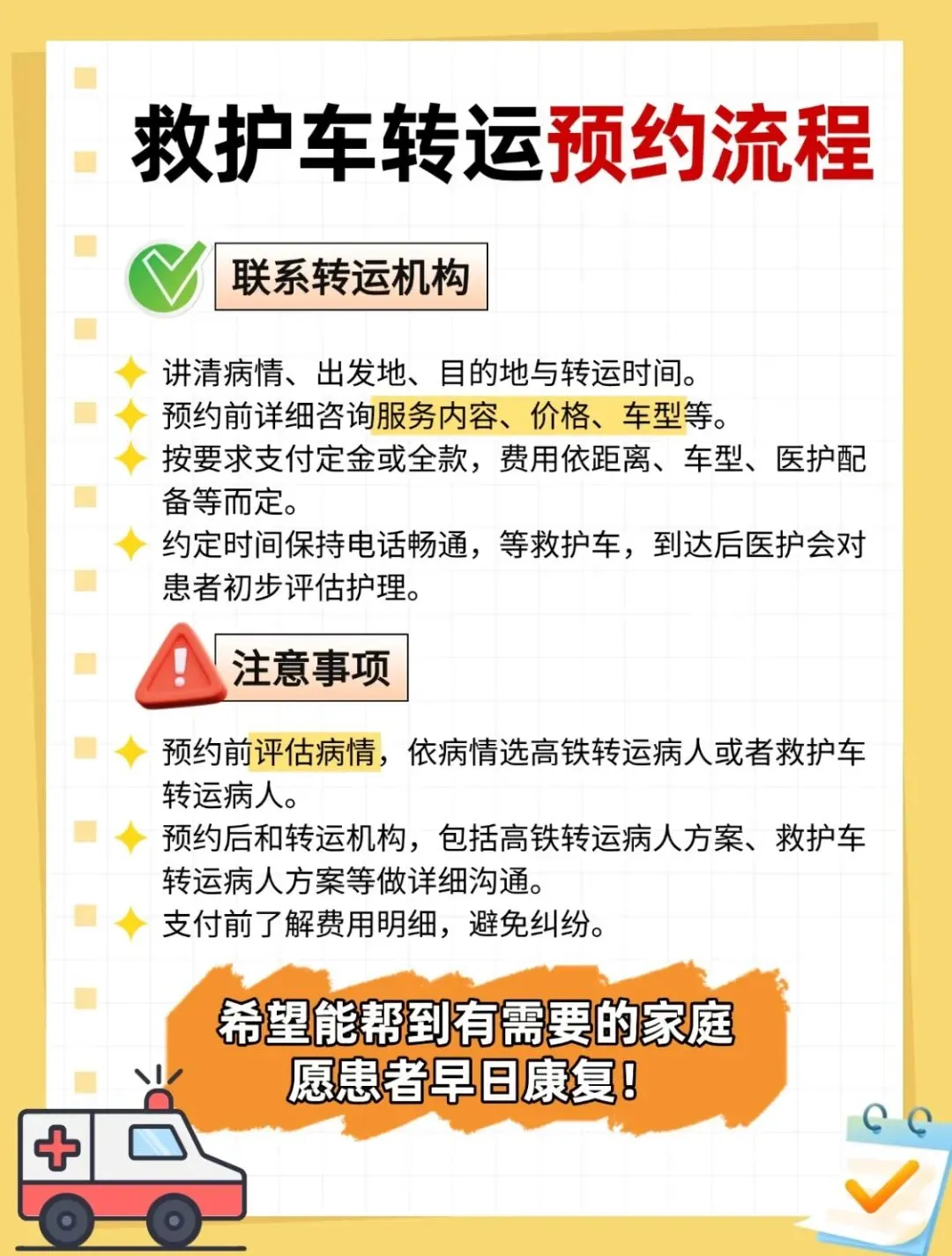我们是正规的非急救转运公司,设备专业,按需匹配。在救护车收费方面,比如出院回家、长途转院、跨省长途,我们按照公里数收费。比如1kM、2KM、3KM的短途,仅收取起步费用。如果需要吸氧、呼吸机、吸痰器等专业设备,按具体使用了什么设备收费,全程没有额外收费。