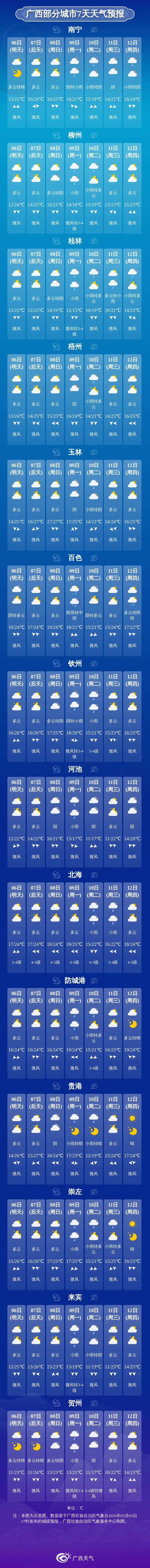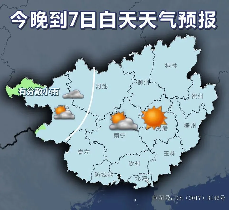 今天晚上到7日白天,全区多云到晴,其中桂西北阴天间多云有分散小雨。